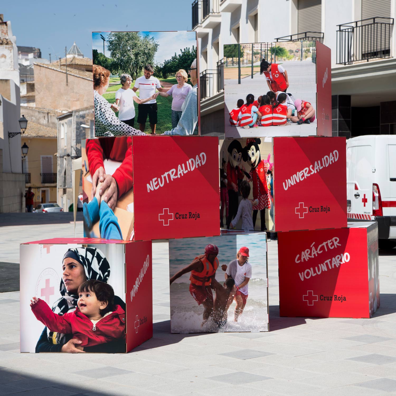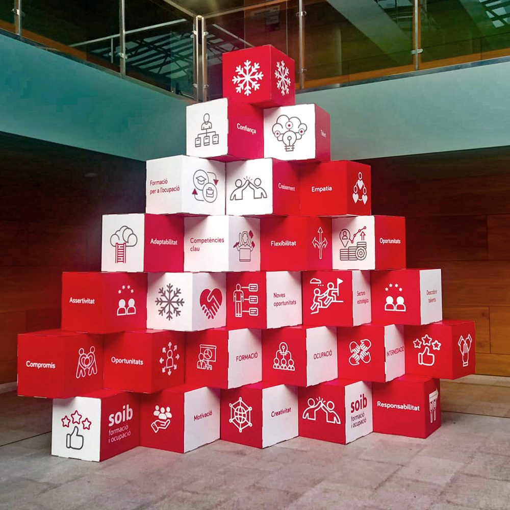 Los cubos de cartón se han convertido en un formato muy recurrente para grandes campañas, como la de difusión de los Objetivos de Desarrollo Sostenible (ODS) de la ONU. Se trata de una serie de metas globales que debemos alcanzar para erradicar la pobreza, proteger el planeta y asegurar la prosperidad para todos. Otro tipo de difusión, más local, pero de gran interés ciudadano, es la que realizaron en Baleares para dar a conocer las funciones de su servicio de empleo y formación (SOIB). Cada cubo representaba un mensaje trasladado a través de iconos y de tipografía impresa sobre la superficie bicolor de sus caras.