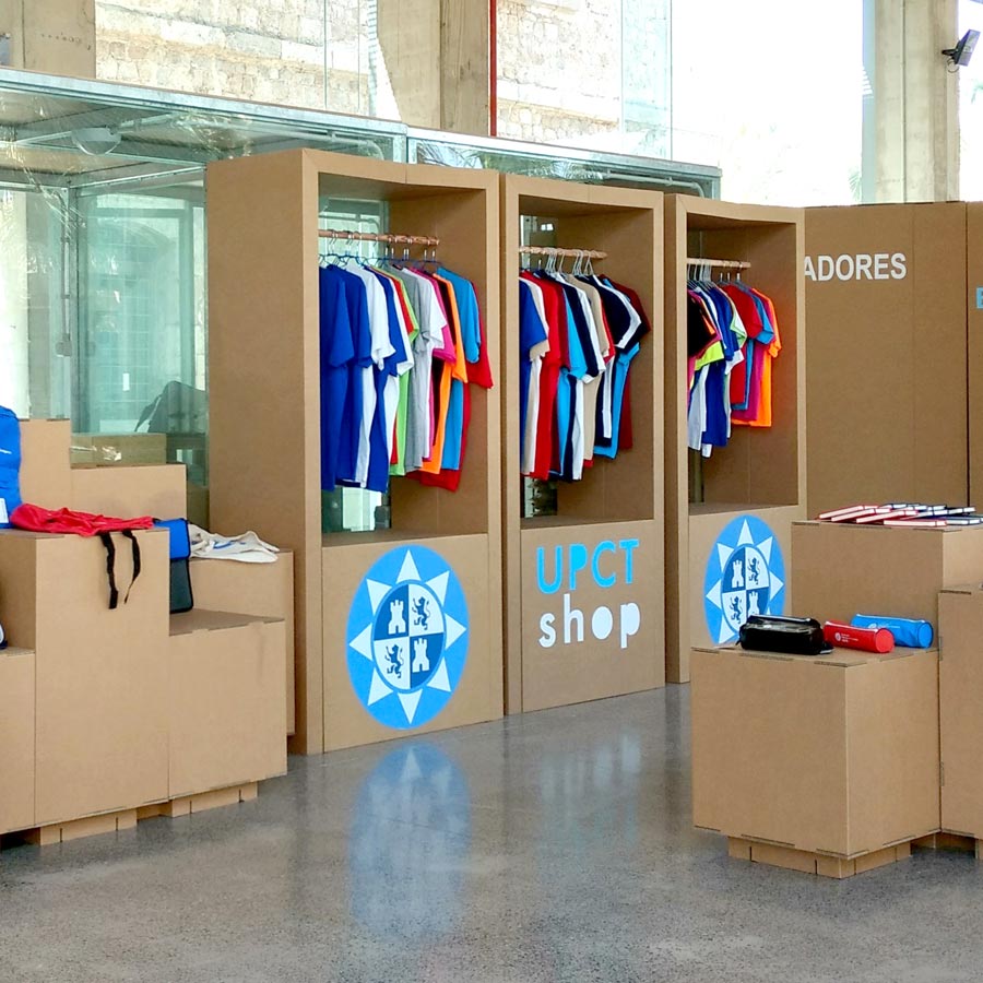 La elección del mobiliario y de los materiales con los que mostrar tus productos comunica mucho sobre tu filosofía de negocio. Un buen ejemplo son las tiendas pop up de la UPCT y de la UPNA, universidades comprometidas con el medio ambiente a través de la elección del cartón como material.