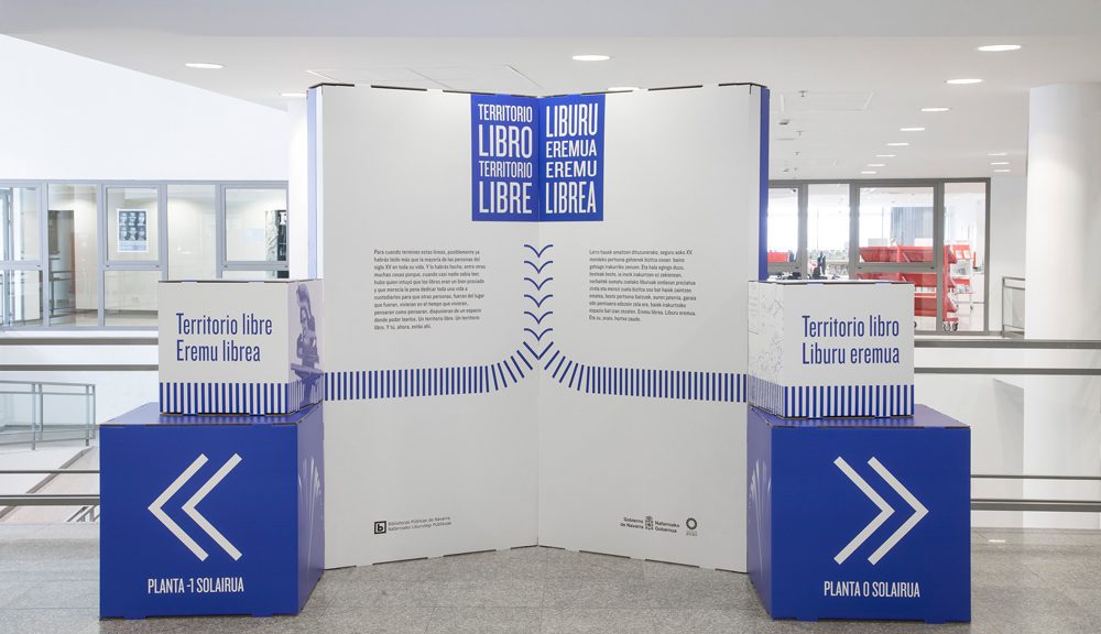 Un buen ejemplo de uso de los cubos en exposiciones lo puedes encontrar en ‘Territorio libro, territorio libre’, organizada por la Red de Bibliotecas de Navarra. Nos los encontramos como herramienta divulgativa, como elementos que definen el recorrido por la muestra y como objetos interactivos.