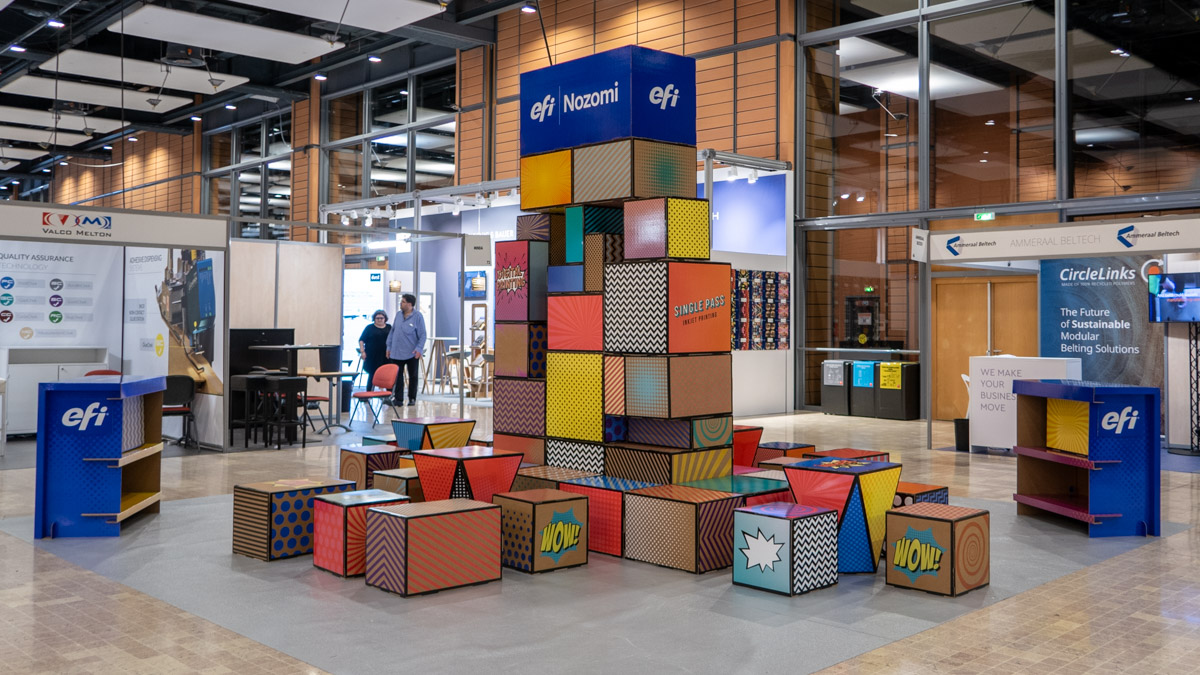 Hay muchas formas de montar un stand. Agrupar cubos de forma creativa es una de ellas. Y funciona, el resultado es de lo más llamativo. Si se trata de captar miradas, con los cubos lo puedes lograr. ¿A que ya te estás preguntando qué habrá en ese CD de la foto?
