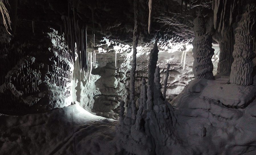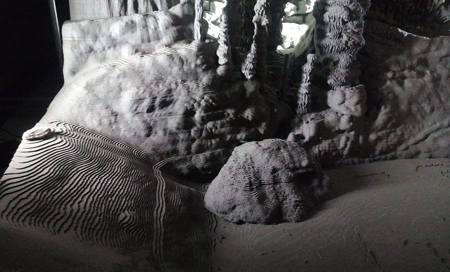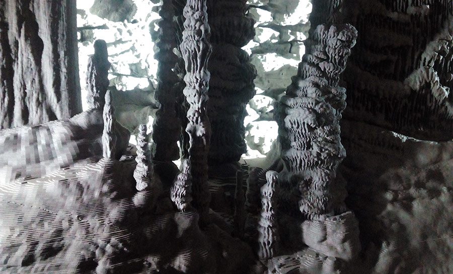 La reconstrucción de la cueva utiliza como material visual de partida una postal turística, seguido de un concienzudo proceso de fotografiado y modelado en 3D digital estratificado.
