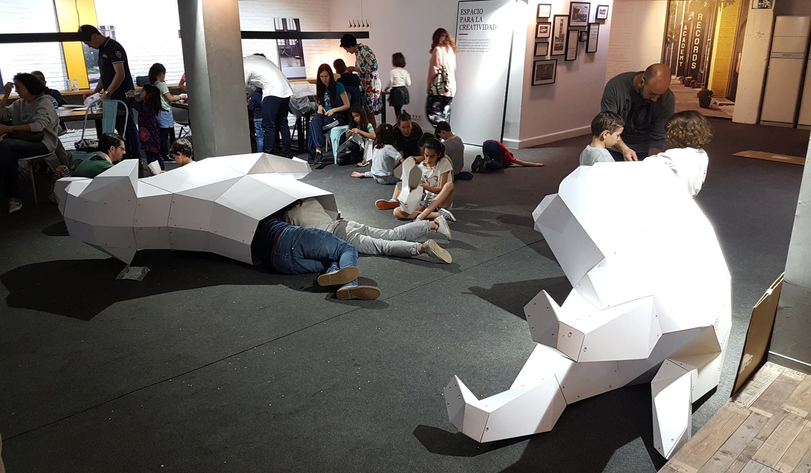 En colaboración con entidades como Fundación Cerezales o MINI HUB Madrid, hemos desarrollado propuestas donde los niños construyen muebles, disfraces, esculturas o incluso un perro gigante low poly.