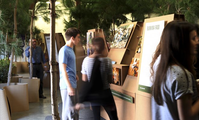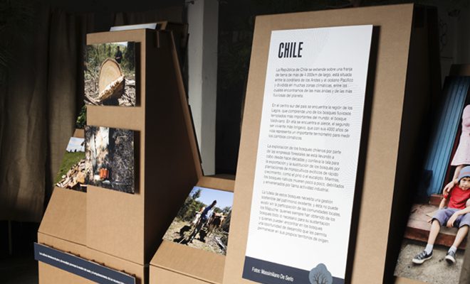 La exposición ‘Plantéate un cambio’, organizada por ACSUR Las Segovias y Ecologistas en Acción, buscaba crear conciencia a favor del consumo responsable y de una gestión global y sostenible de los bosques. El montaje se componía de fotografías que representaban la relación entre la humanidad y la naturaleza en distintos países del mundo. La coordinadora del proyecto, Paloma Ferrer, nos encargó unos soportes personalizados en cartón. Pensando en algo original y práctico, diseñamos módulos expositores con distintas inclinaciones en los que colocar las fotografías y cartelería impresa con textos explicativos. Un juego de volúmenes que aportaba dinamismo al espacio una vez completada la instalación.