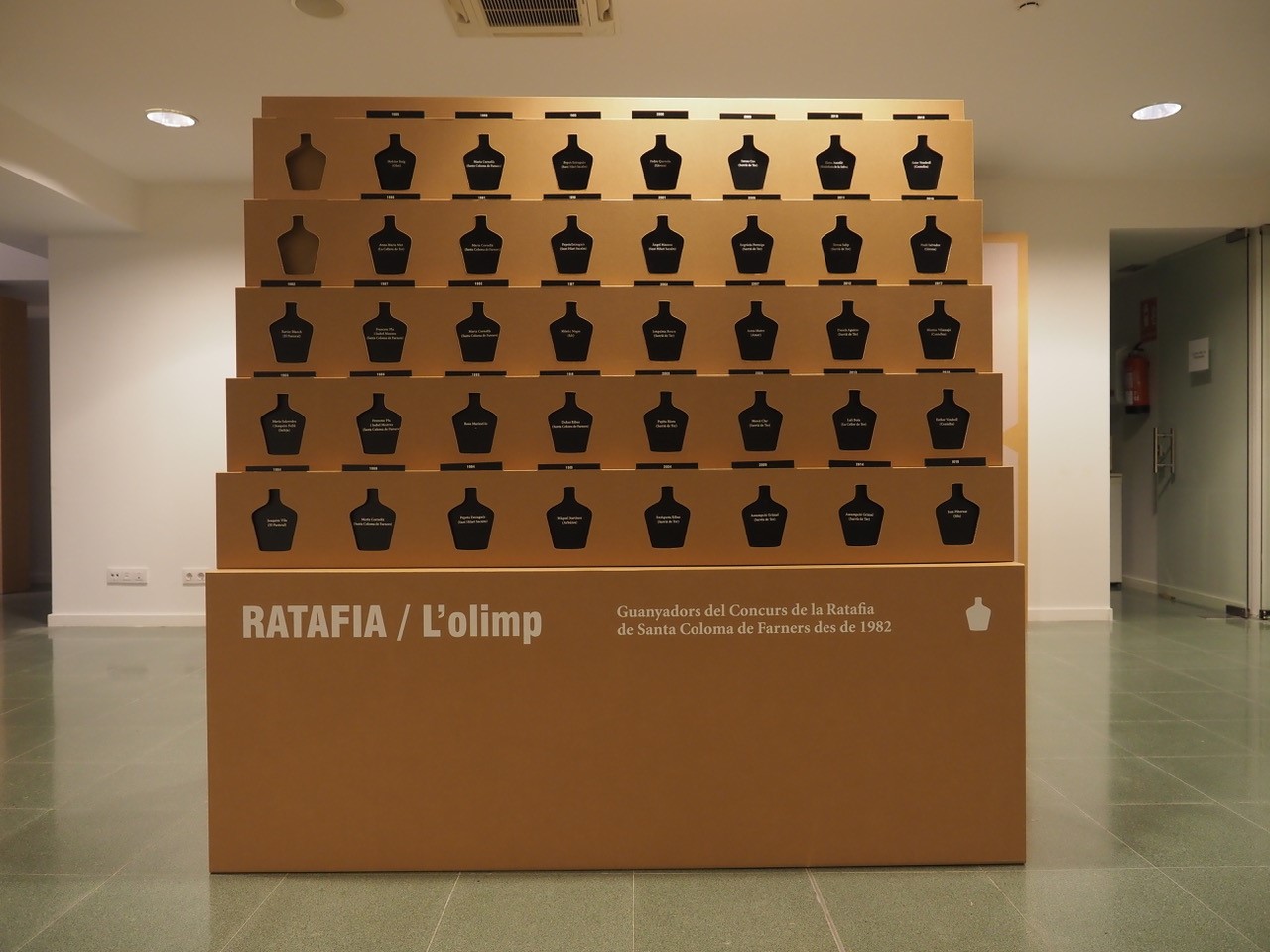 El expositor Olimpo es de estructura escalonada, mide 195 x 45 cm y está pensado para mostrar a los ganadores/as del tradicional Concurso de la Ratafía. Se trata de un sistema con espacios recortados en los que introducir fichas de cartón impreso con el nombre de las personas premiadas. Visualmente, muestra una serie de siluetas que se corresponden con la del galardón. De esta forma se consigue tener un expositor perpetuo con un sistema anual de actualización ágil y económico. Además, se instaló de forma pareada, dos estructuras idénticas, unidas por su parte trasera. Por un lado, se muestran las personas ganadoras desde 1982 y por el otro las de esta y las próximas ediciones (hasta 2062). El expositor permite a la vez la circulación de la gente a su alrededor, convirtiendo al Olimpo de la Ratafía en el centro del espacio expositivo.