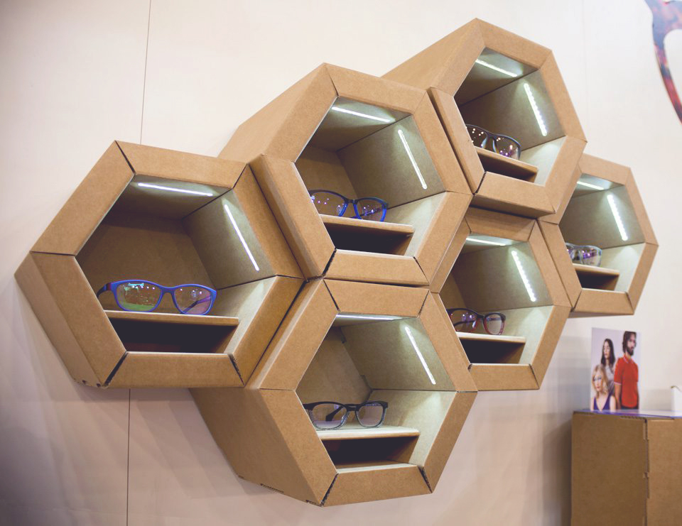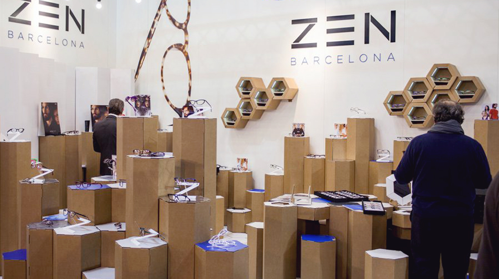 Determinadas formaciones minerales, como las columnas de basalto,  pueden encontarse espontáneamente en la naturaleza formando espectaculares construcciones hexagonales. Un ejemplo de ello es  la Calzada del Gigante (Irlanda). Siguiendo esta geometría, e  inspirándonos en las proporciones de la baldosa hexagonal hidráulica de Gaudí que pavimenta el Paseo de Gracia de Barcelona diseñamos  un stand de módulos hexagonales para la óptica Zen. Módulos de cartón de diferentes alturas, formando una composición visual única. Se utilizaron para mostrar gafas y como piezas de mobiliario. Con el tiempo, el tótem hexagonal de cartón inspirado en el stand de Zen se ha convertido en un elemento expositivo habitual de nuestro catálogo.