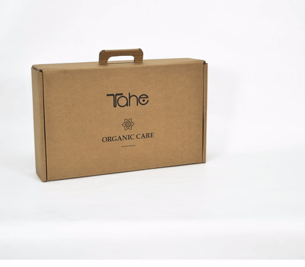 Diseñamos una caja maletín en cartón para facilitar el transporte de los productos a los comerciales de Tahe. Un packaging fácil de abrir y cerrar, con un asa cómoda y cavidades internas para colocar los productos. Incluía además espacio para transportar folletos y catálogos. Producido con cartón ondulado con acabado kraft, estaba personalizado con el logo y el nombre de la nueva gama en el exterior, y gráfica impresa en el interior con los criterios de elaboración de los cosméticos. Incluía 13 productos diferentes y un compartimento interno con una pala de madera para aplicar tratamientos. Se produjeron 300 unidades que se repartieron por toda España.