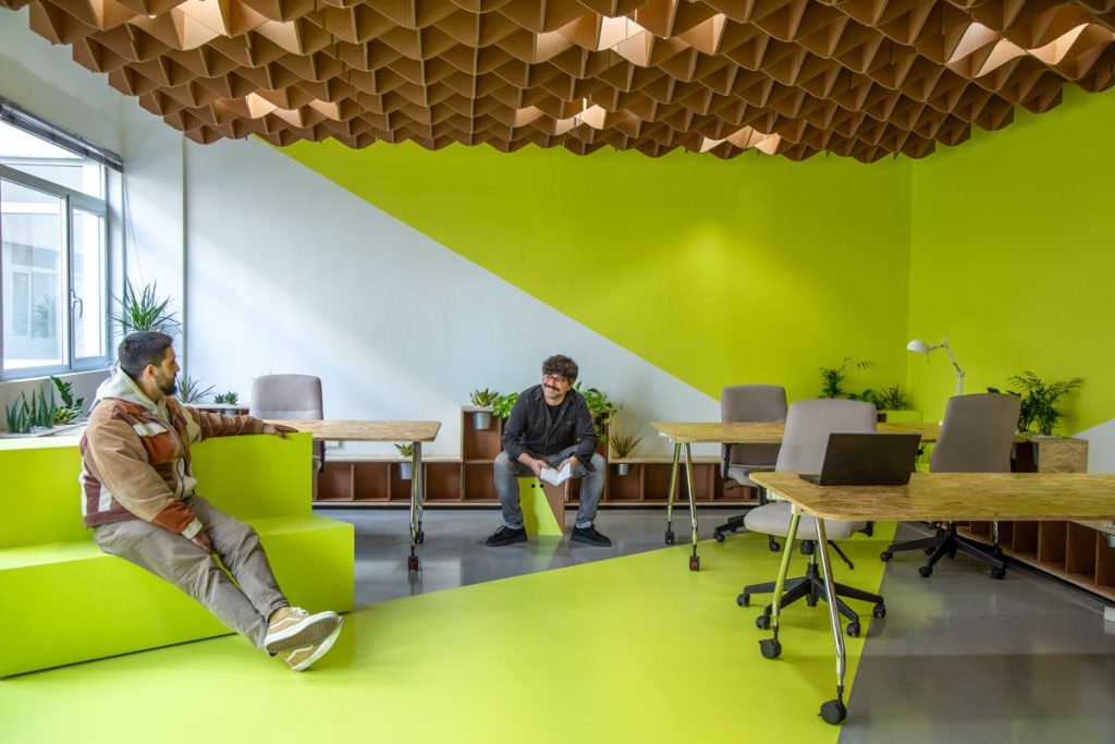 ¿Cómo convertimos una sala de 120 metros cuadrados en un epicentro de innovación sostenible? La respuesta, una vez más, está en el cartón. Lo primero que llama la atención nada más entrar a Nébula es el techo acústico fonoabsorbente. Diseño que hace más acogedor el espacio, mejora su estética y, genera confort acústico. La estructura de cartón ondulado no solo es visualmente impactante, sino que también es un testimonio tangible de nuestro compromiso con el medio ambiente.