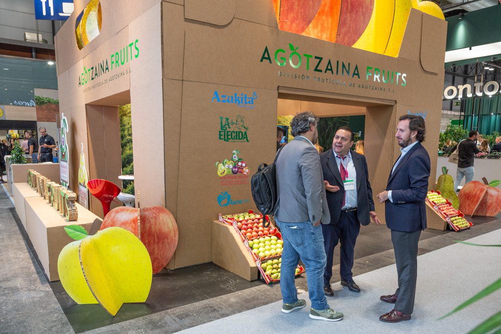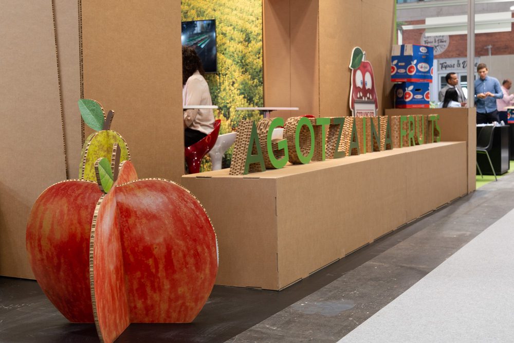 A petición de la agencia Pieldegallina, asumimos el reto de adaptar y producir el diseño que habían planteado a la división frutícola de la empresa Agotzaina. Se trataba de reproducir en cartón una de sus cajas de fruta a tamaño gigante. Y además incorporarle peras y manzanas a escala y unos corpóreos a la entrada. En su interior, se habilitó espacio para una barra en la que interactuar con sus clientes e incluso para un almacén. Como resultado, conseguimos montar uno de los stands que hacían girar la cabeza a los visitantes de Fruit Attraction 2022.