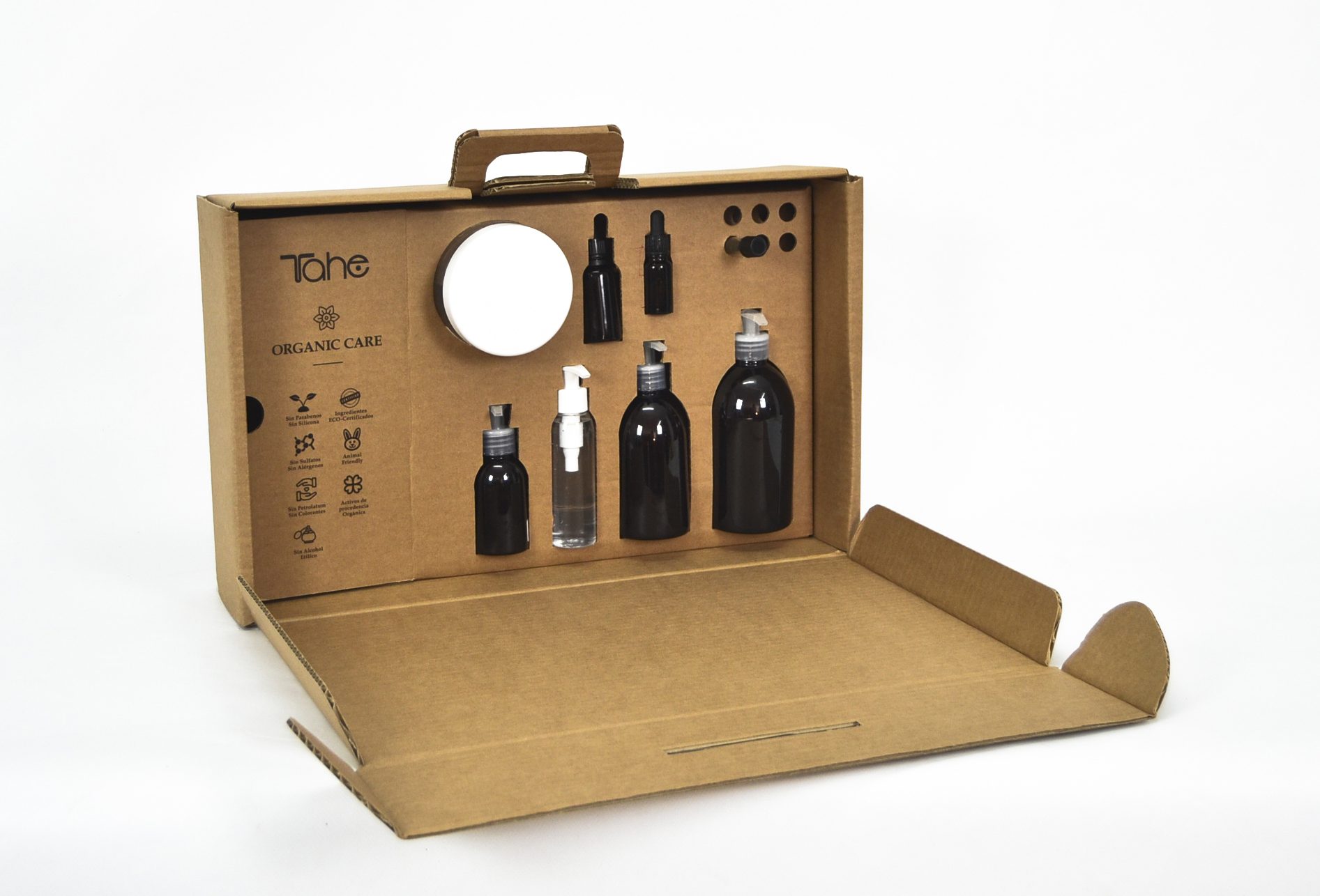 Complementariamente, también diseñamos una caja maletín en cartón para facilitar el transporte de los productos a los comerciales de Tahe. Un packaging fácil de abrir y cerrar, con una cómoda asa y unas cavidades internas para colocar los productos.