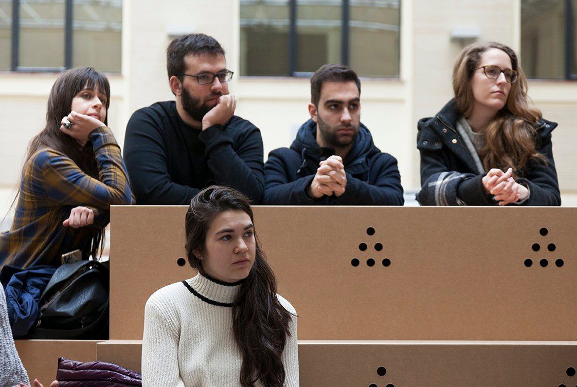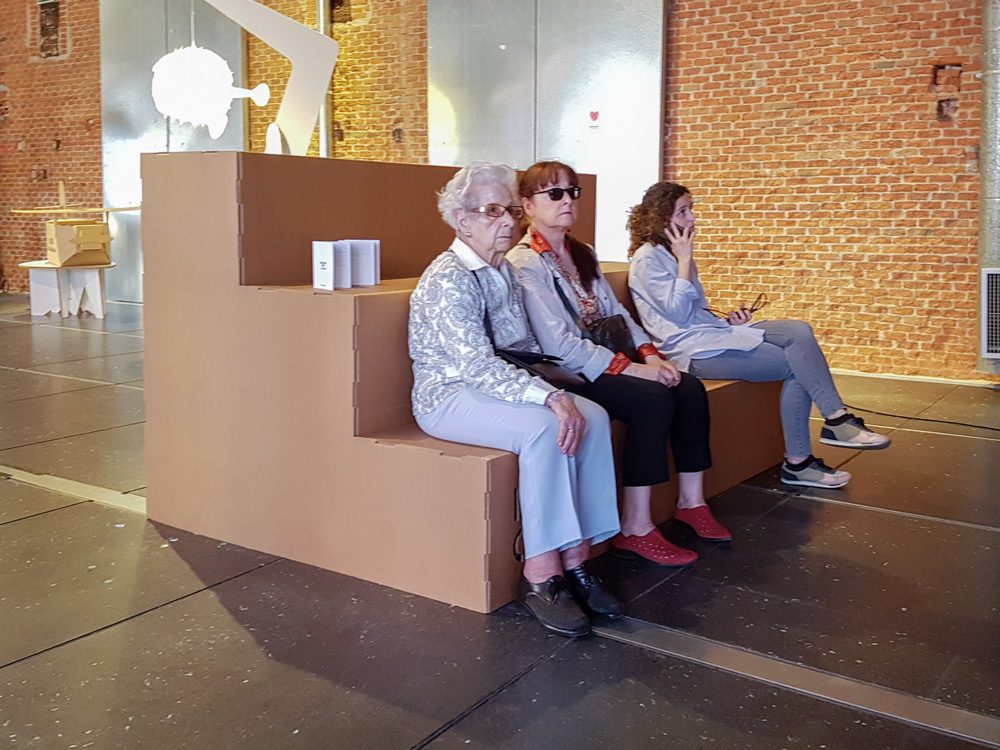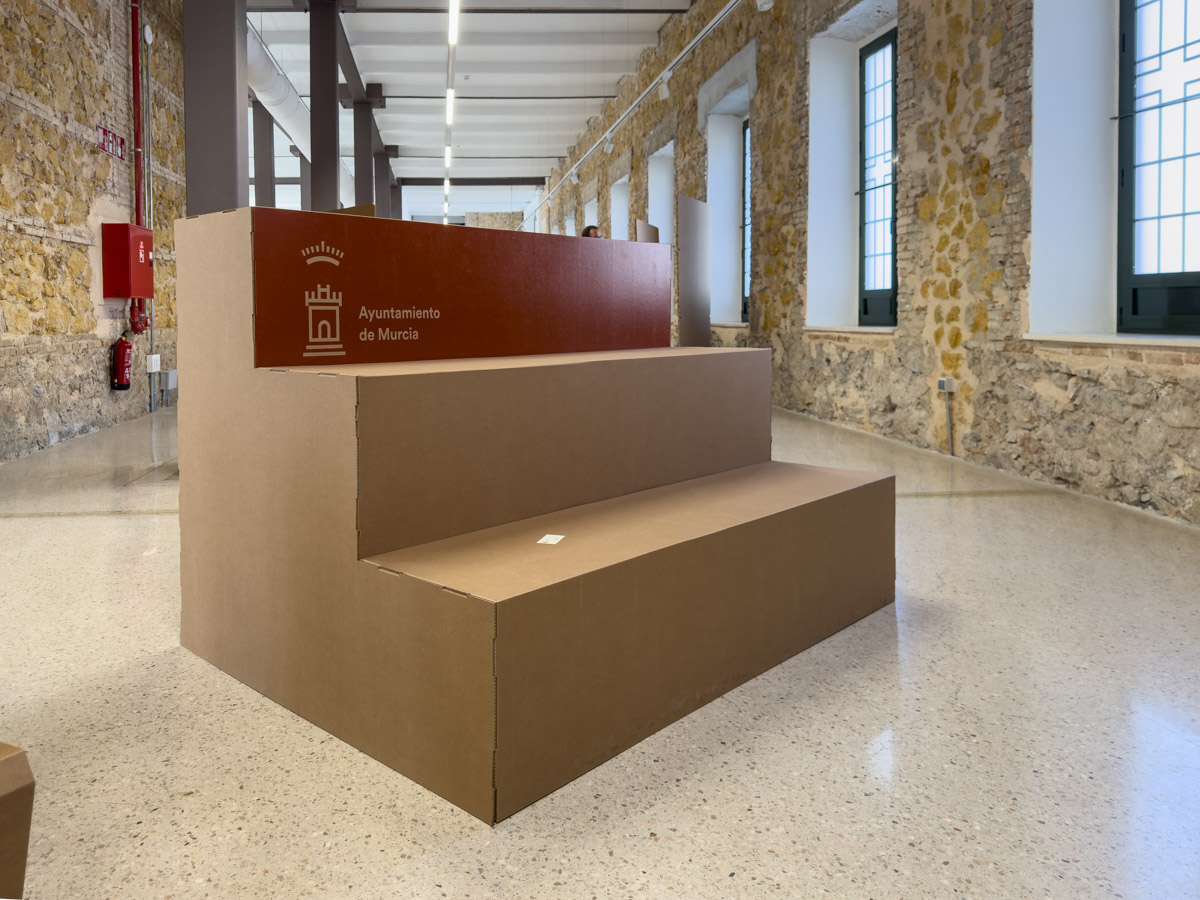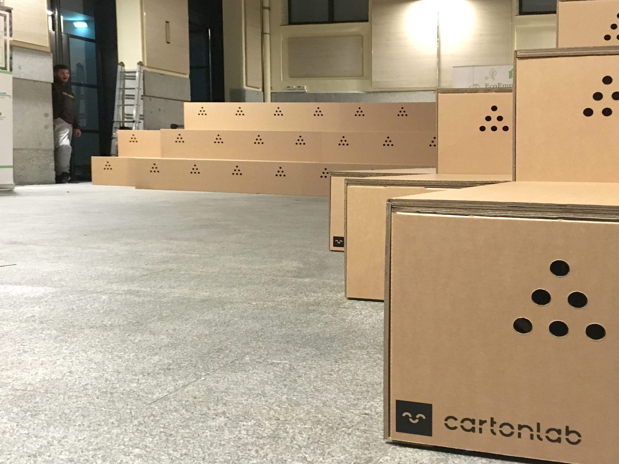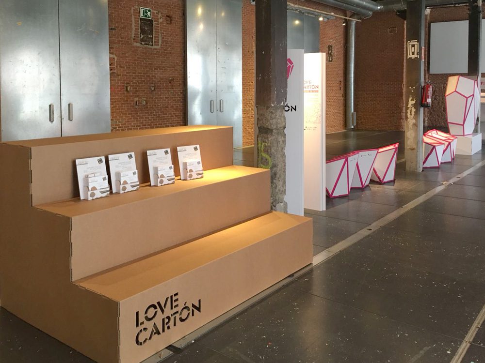 El diseño escalonado de la grada permite sentarse con comodidad, pero también exponer todo tipo de elementos. Así se hizo en Love Cartón, un evento dedicado al diseño en cartón como herramienta clave para un consumo más sostenible.
