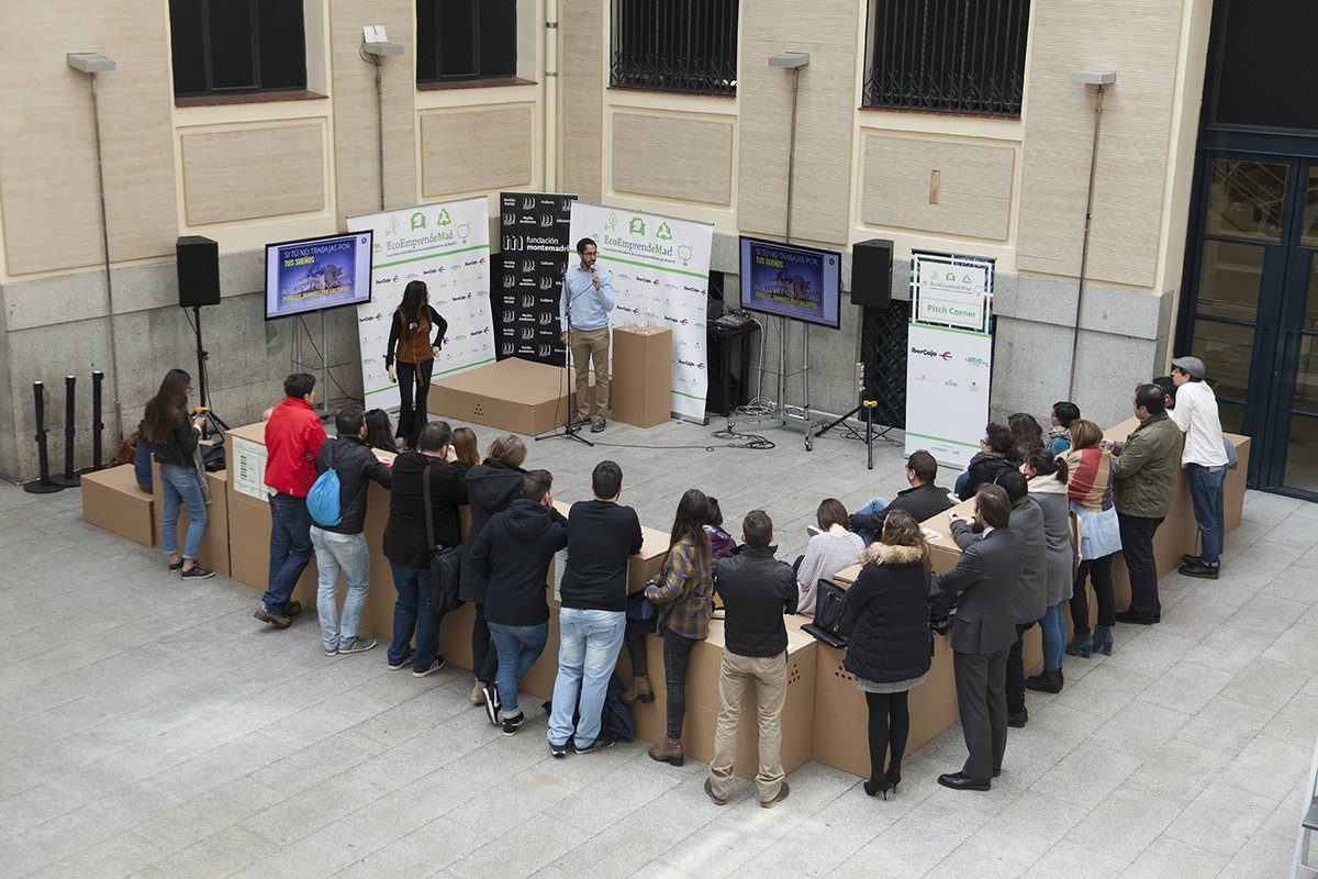 El diseño de la grada de cartón es muy resistente, totalmente fiable y sometido a diversas pruebas de peso. Su estructura ha sobrevivido ya a la intensidad de varios eventos. Uno de los primeros fue una microferia para emprendedores ambientales en La Casa Encendida. Apostaron por unas gradas personalizadas con motivos troquelados y acabado kraft que funcionaron a la perfección. Con el tiempo, hemos ido optimizando aún más la capacidad de la grada y ajustando su diseño a las necesidades del cliente.