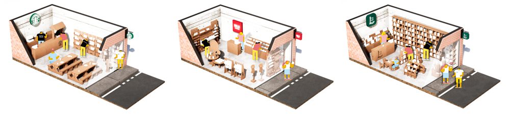 El diseño en cartón es tan flexible que te permitirá crear diferentes combinaciones con los mismos elementos. Se adapta a tus necesidades y destaca por su rapidez en cuanto a producción y montaje. Como muestra, esta prueba que realizamos en 3D. Tres planteamientos de interiorismo comercial distintos para un mismo espacio: una cafetería, una tienda de libros y otra de retail.