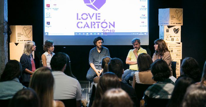 Nuestra presencia en Love Cartón consistía también en mostrar nuestras creaciones de forma original y tangible. Lo hicimos con un stand que incluía una gran trasera en forma de biombo personalizado en el que los asistentes pudieron conocer nuestros proyectos más destacados impresos sobre el cartón. Y es que Love Cartón era también una gran feria de muestras, a la que concurrieron interesantes propuestas.