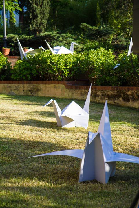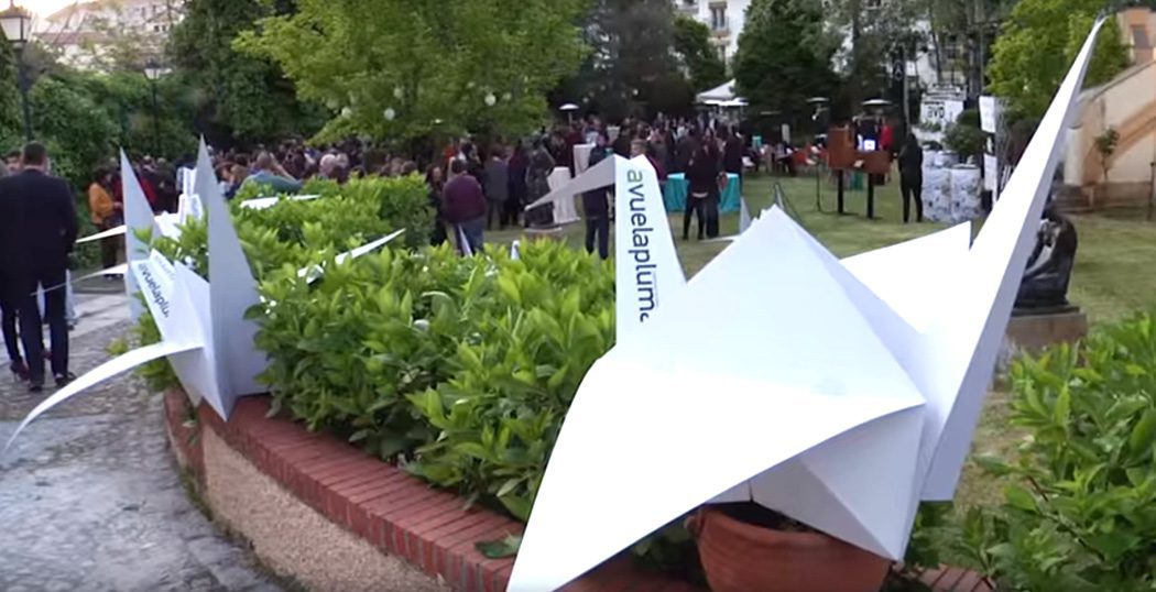 La técnica del origami se plasma en proyectos como nuestras grullas gigantes de cartón, creadas para los Premios Avuelapluma. Estas figuras de 1,65 metros de ancho, fueron diseñadas con cartón microcanal reciclable y personalizadas con el logotipo del cliente. Además, su ligereza permitió colgarlas de árboles, aportando una estética única al evento.