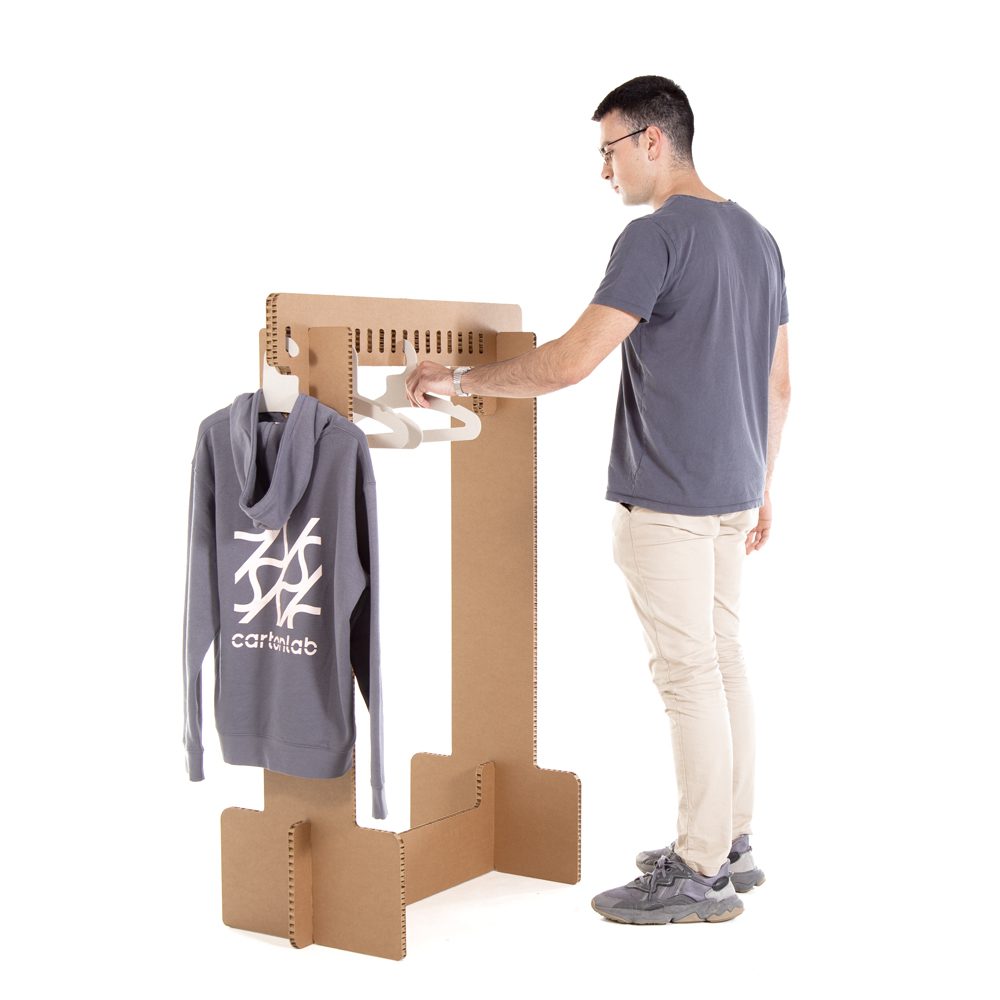 Las perchas de cartón de Cartonlab KLETT están diseñadas para resistir y adaptarse a cualquier necesidad. Fabricadas con cartón compacto de 3 mm, son ideales para ropa de todo tipo, desde camisetas hasta chaquetas. Su diseño asegura que la prenda no resbale, y ocupan menos espacio que una percha convencional. Son una solución funcional y profesional para ferias, pop ups o cualquier entorno donde la eficiencia, la estética y la facilidad de transporte importen. Además, se pueden combinar con burros colgadores KLETT o cualquier otro tipo de mobiliario de cartón orientado al retail.