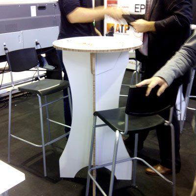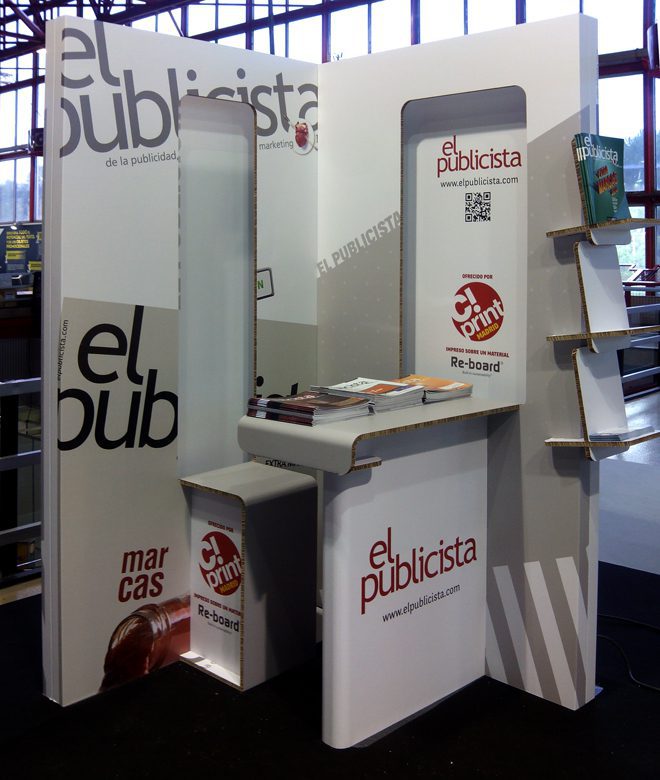 En C!Print se ha podido comprobar cómo la tendencia de DISEÑO DE STANDS y Muebles de cartón es ya una firme realidad. En el pabellón podían verse todo tipo de soluciones para mostradores, sillas, traseras de stands, porta-folletos y expositores de producto realizados en cartón y personalizados con la imagen gráfica de las distintas empresas.