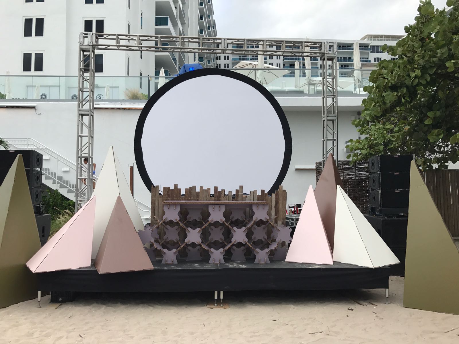 What a weekend we just spent in Miami. As part of the Miami Beach Art Basel, a show that features crème de la crème modern art from Europe, North America, and Latin-America. The show travels to Hong Kong in March and comes back to Basel (Switzerland) in Summer. Every December we enjoy magnificent pieces from consolidates and emerging artist. Paintings, sculptures, installations, photographs, films, and performances become part of the Miami Beach landscape for a weekend. On this occasion, we designed, developed, and produced cardboard structures for a show in the exclusive Hotel 1. A creative DJ Booth table together with different sizes pyramids made this stage a cool place for the artist to express his/her music. The red/purple lighting gave a futuristic aura to the show.
