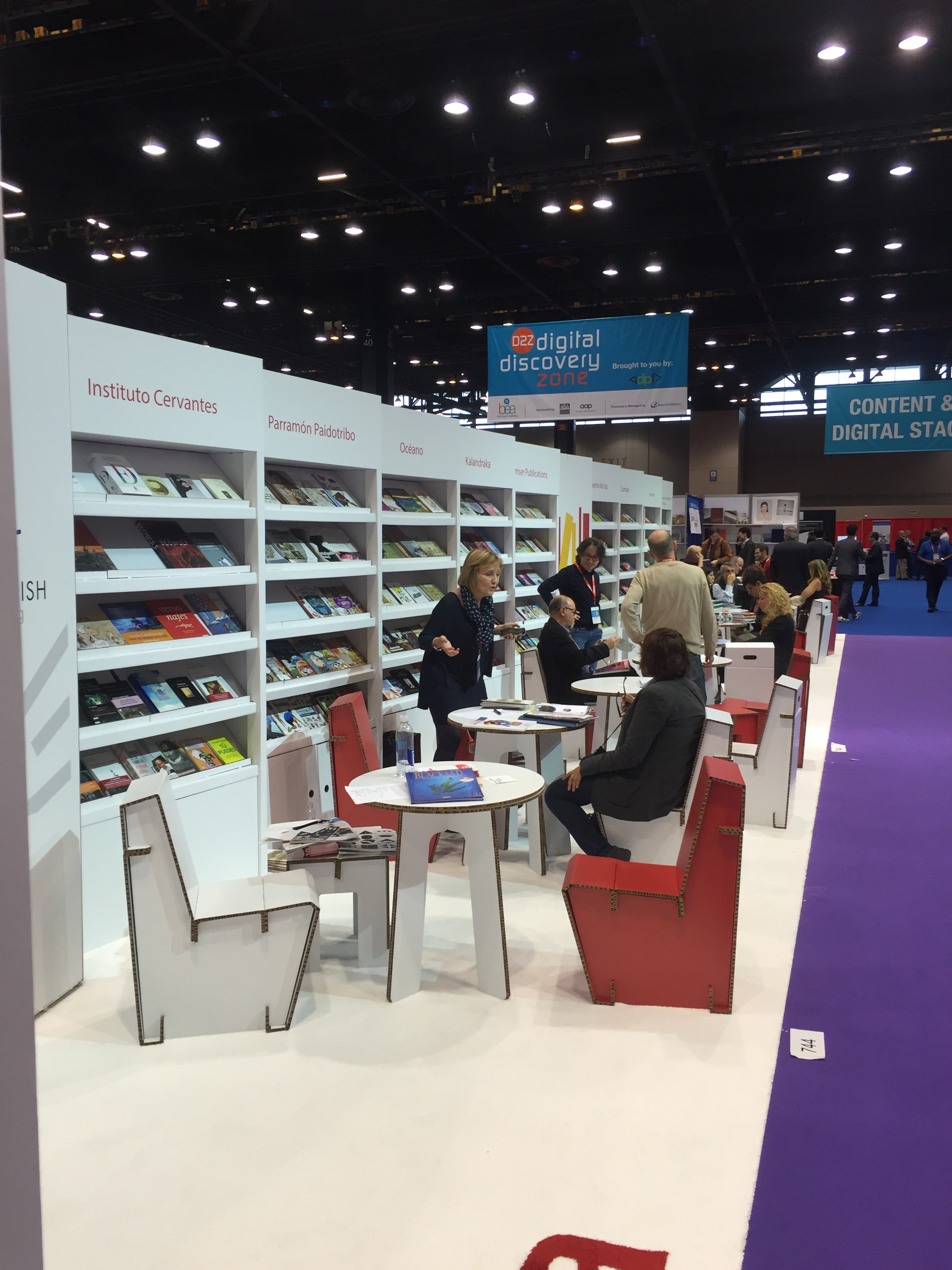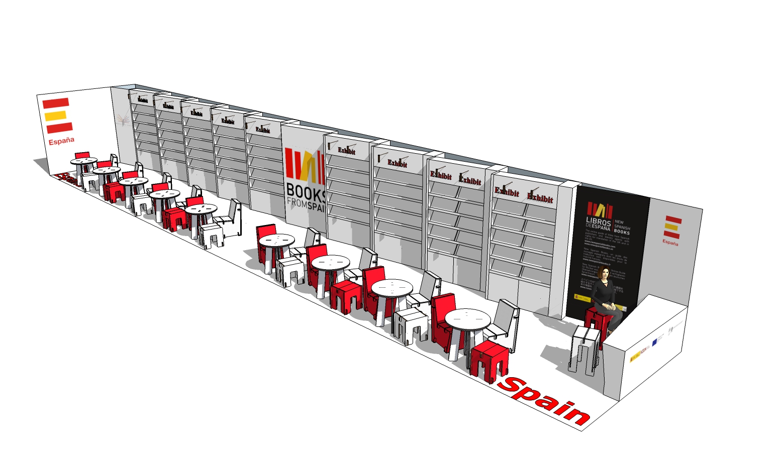 The booth was about 60′ x 20′ and the height of the bookshelf about 10′. Publishers were able to display about 500 books and conduct business in our Desk and Chairs for 3 days. The installation took us less than 12 hours and dismantling only 1 hour. All material was recycled after the show.