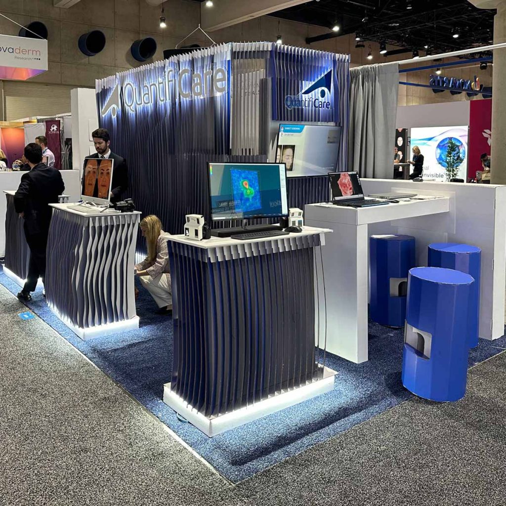 Quantificare is a renowned healthcare technology company. They create body scanning hardware and software systems. For the AAD Meeting in San Diego, California, they needed an impressive booth that would meet several needs. To make a visual impact, be practical to serve visitors and combine sophisticated design with environmental responsibility. They contacted us and our proposal ended up becoming a new adventure in the USA, at one of the most important dermatology trade fairs in the world.