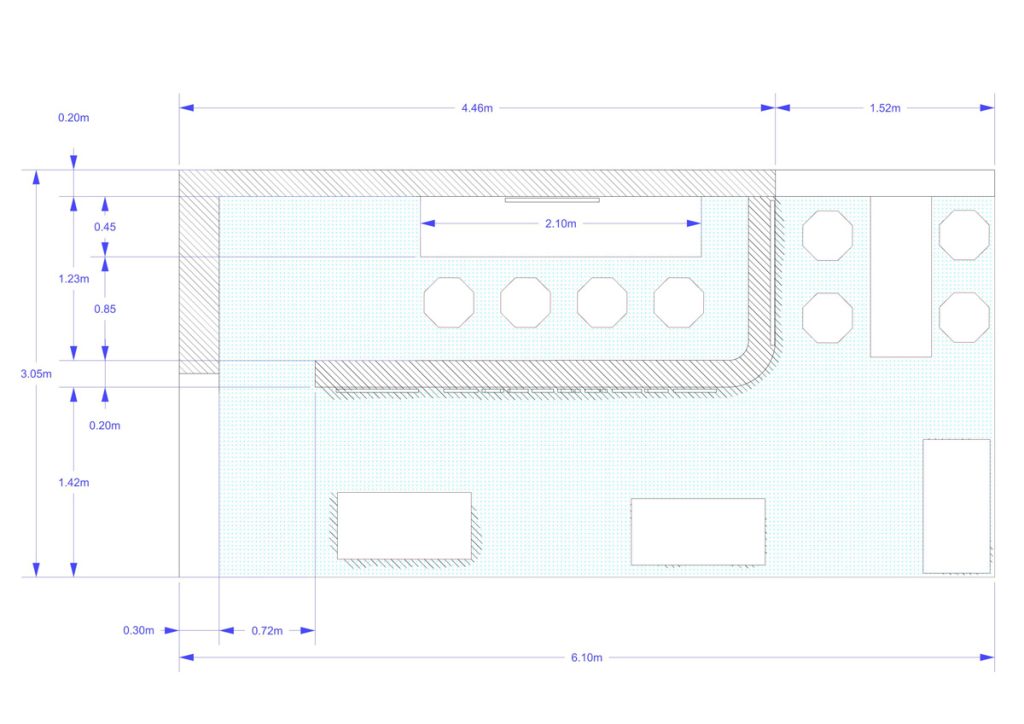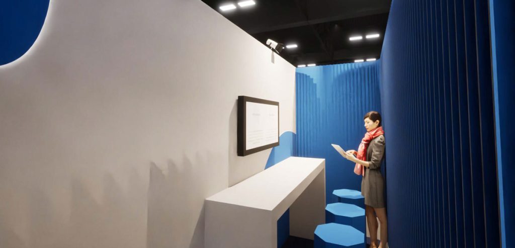 The starting point was the idea of creating a structure that would evoke the fluidity and beauty of waves. Furthermore, we had to bring that vision to life in record time. Inspired by the client, and by some of our previous projects, we came up with a design with diagonal slats that create an outward undulating effect. Each of these slats was meticulously positioned, numbered and colored in blue and white, allowing the appearance of the booth to change depending on the angle from which it is viewed. So the fluidity we mentioned was reinforced as visitors moved through different points of the space.