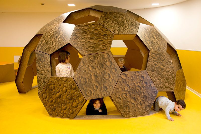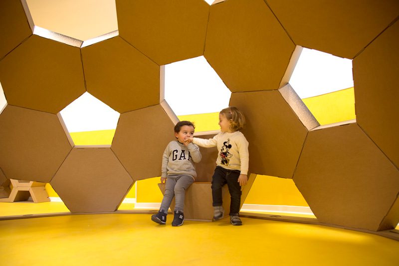 A cardboard geodesic dome is ideal for toy libraries, nurseries, playgrounds and play spaces. A good example is this structure made from hexagonal modules cardboard attached to each other. Are 25 modules in total, which make up a space of 4 meters in diameter. Iscustomizable with colors, images and different textures. And very stable, so much that allows variations within its structure. For example, the opening of windows that provide the interior with light. They serve, as well as a resource for children to play, leaning out or even moving through them.