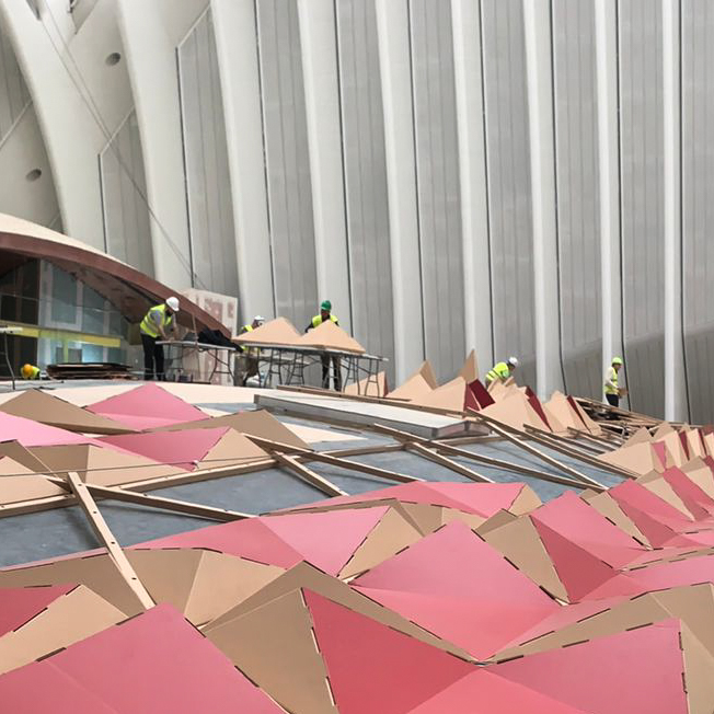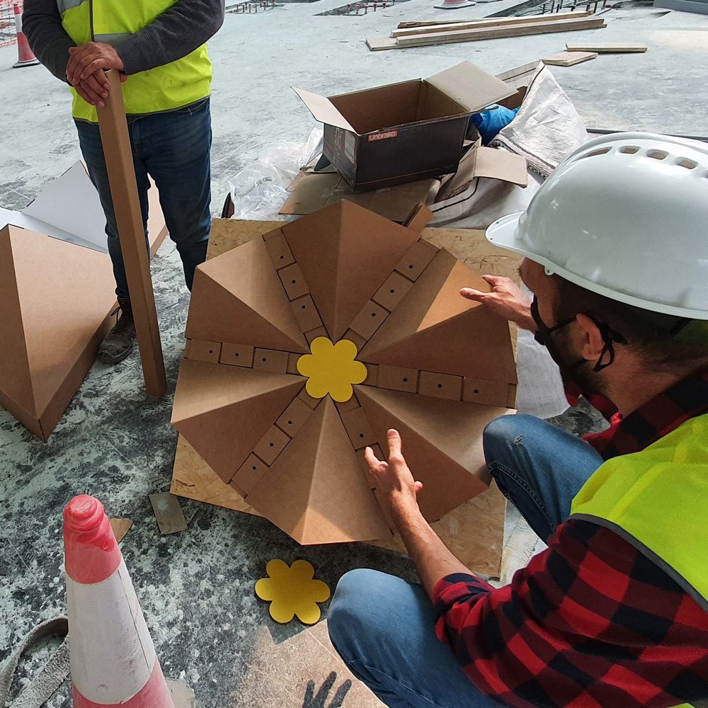 The design work with the Xpiral team started from an initial prototype produced in our studio. Through parametric variations, we were generating the design of the entire shell. The intervention extends over an area of warped roof surface of almost 400m2. We used 189 polygonal modules, all different, with a base of about 2 m and variable height. In total more than 1000 unique pieces, numbered, ordered and with a specific predefined position.
