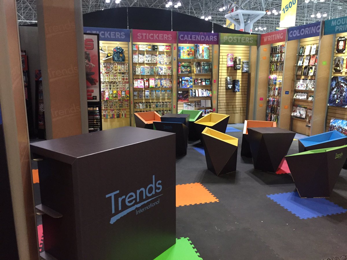 Working with Trends International was a great cardboard experience. As you can see in the pictures, Trend's booth was designed to attract attention from the attendants of the NYC ComiCon and ToyFair. This cardboard branded booth using customized chairs, bars and exhibitors tried to communicate the versatility of Trends International using different colors with the ecological and agile values of the Kraft finished corrugated cardboard.