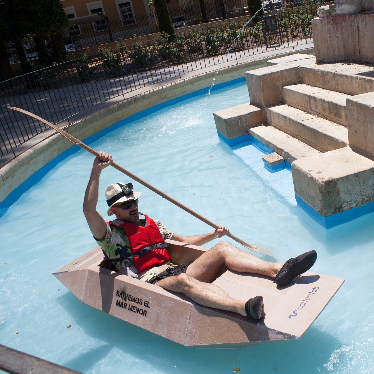 Nous utilisons notre kayak en carton pour naviguer dans les fontaines de la ville de Murcie ensoutien à la campagne #Sauvons la Mar Menor. Notre objectif : attirer l’attention sur la dégradation qu’elle subit et rendre visible les mobilisations que divers groupes promeuvent. Sous l’impulsion de l’initiative citoyenne, elle est devenue au fil des années la première lagune d’Europe dotée de la personnalité juridique.