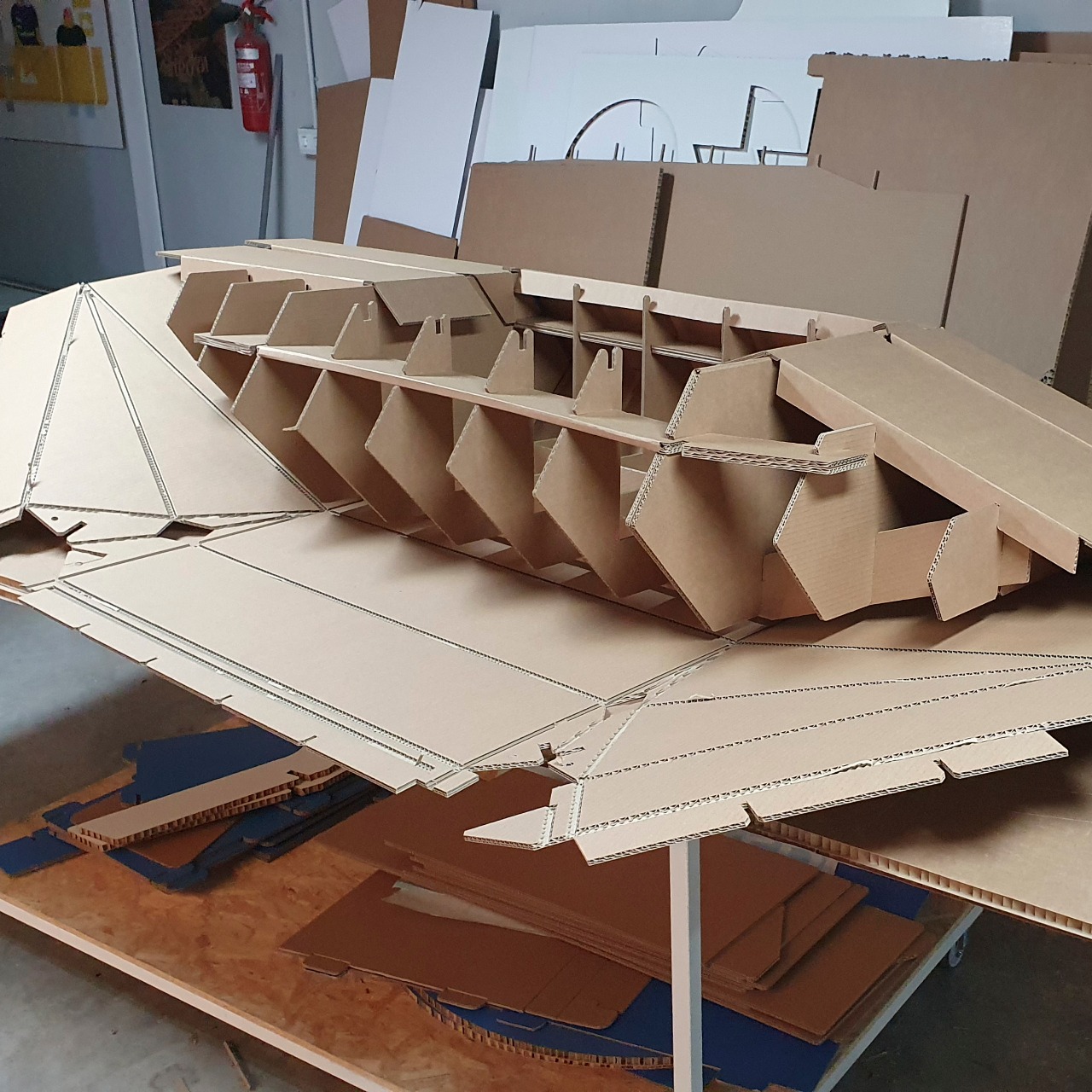 Lastructure est celui quiapporte de la solidité au kayak. Se compose de15 pièces différents imbriqués ensemble. Pour le construire, nous utilisons des feuilles de carton de 7 mm d’épaisseur découpées numériquement. Une fois structuré et habillé des parties extérieures, le bateau mesure 220 cm de haut x 70 cm de large x 4 cm de haut et pèse environ 12 kg. Ilmontage peut se faire entredeux personnes en 15 minutes.