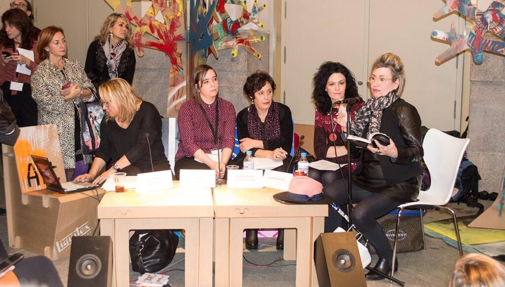 Notre première intervention à Art Madrid a consisté à meubler l’aire de repos avec du carton. Nous plaçons des chaises, des bancs, des tables basses et de grands arbres décoratifs. Nous utilisons du carton ondulé de différentes épaisseurs avec une finition kraft. Le mobilier, assemblé par l’organisation, servait d’aire de repos et de différentes causeries.