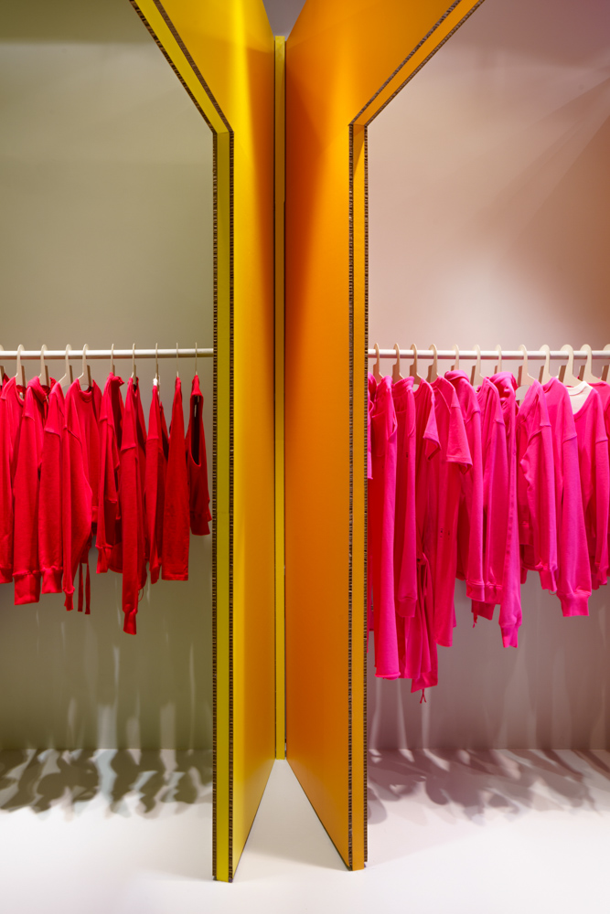 En plus d’être coloré, le résultat devait êtredurable. D’où le choixcarton comme matériau principal. Les portiques qui structurent l’espace sont réalisés en carton imprimé, mais ont unestructure interne en bois qui permet le pré-assemblage en atelier. La forme allongée et particulière de ce type de locaux à Soho nécessite des solutions ingénieuses qui permettent de travailler facilement dans de petits espaces.