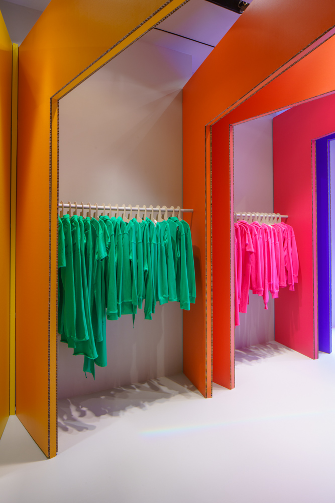 La palette de couleurs utilisée est celle utilisée par Nuhü pour sa collection. Il s’inspire des zones urbaines ou des éléments de New York, puisque la marque a un lien très étroit avec la ville. Le résultat est unconception colorée à la perfectionintégré aux vêtements exposé. La couleur est aussi une ressource très frappante de l’extérieur, surtout la nuit avec le magasin illuminé.