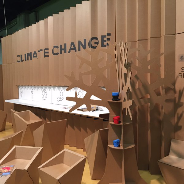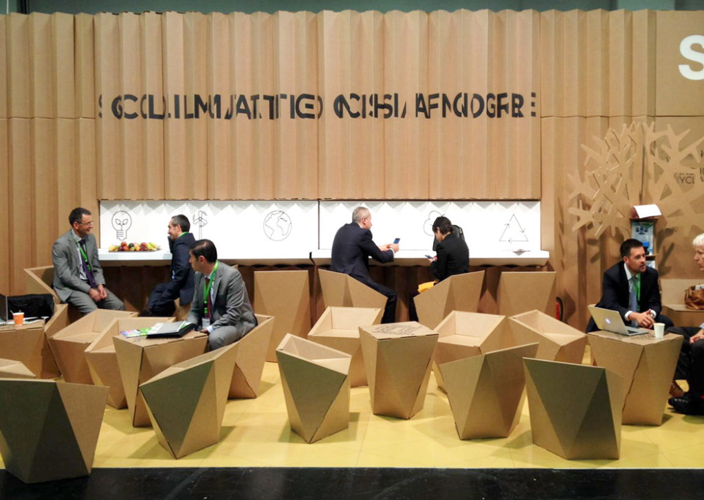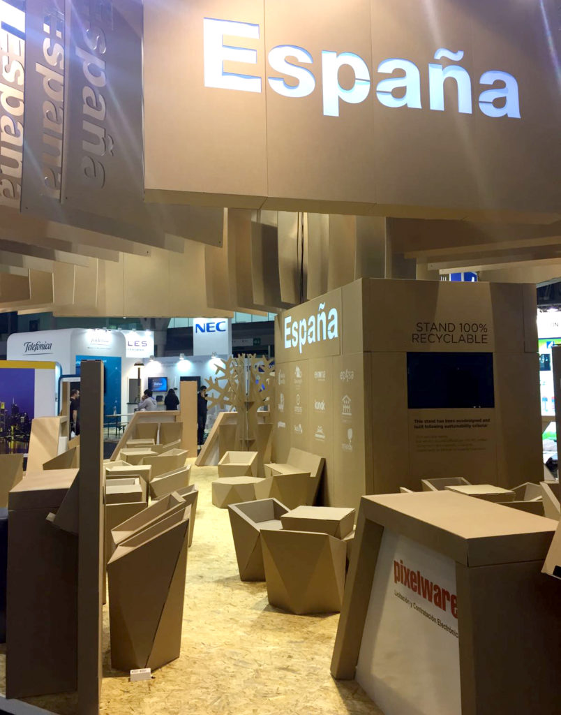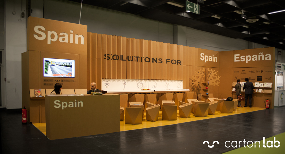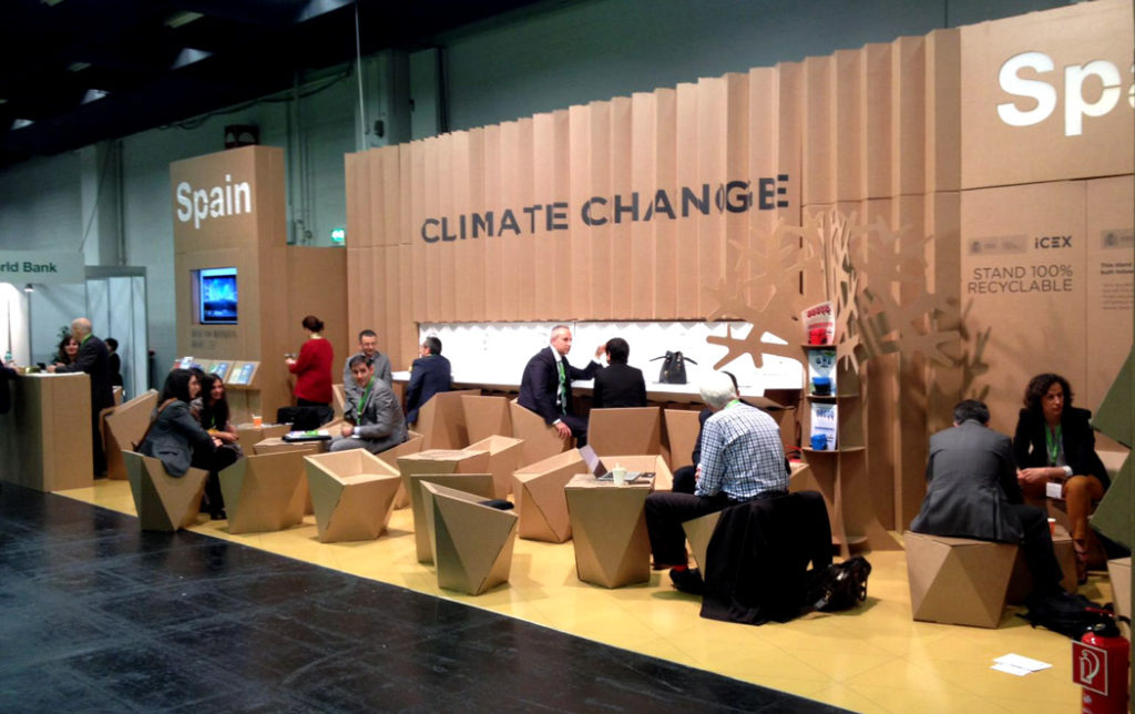 Nous avons conçu et produit le pavillon espagnol convoqué par l’ICEX, réalisé à 100% avec du carton certifié FSC, un matériau idéal pour une foire de ces caractéristiques. L’espace, de 30m2, était composé de plusieurs panneaux arrière plissés et de différents éléments de mobilier. Selon le point de vue des visiteurs, ils pouvaient lire une partie du slogan : Solutions pour ou Changement climatique. Le pavillon espagnol était divisé en 3 zones :