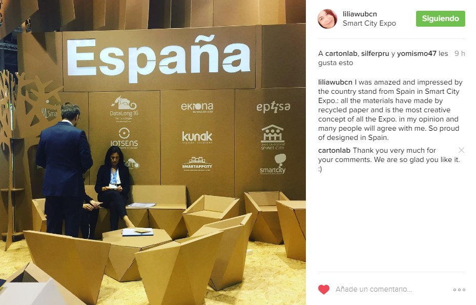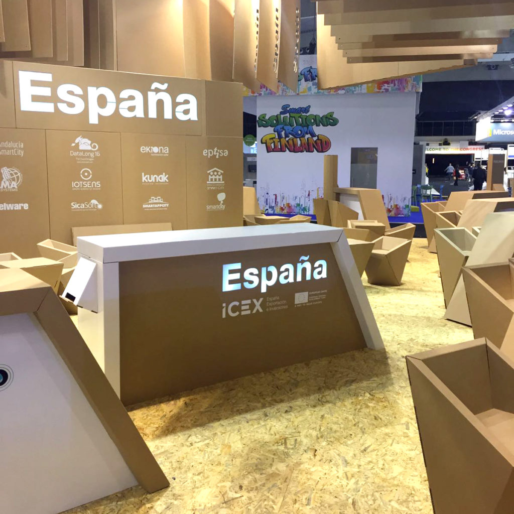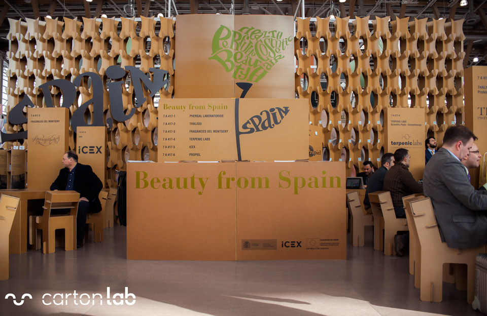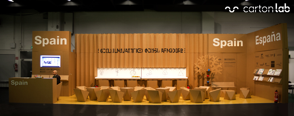 Le stand comporte plusieurs zones différenciées, une pour chaque entreprise, et une zone centrale commune pour les informations générales située dans le stand de l’ICEX. Chaque entreprise dispose d’un kit de mobilier personnalisé à l’image de sa marque, conçu et produit à 100% en carton structurel. Le kit comprend :