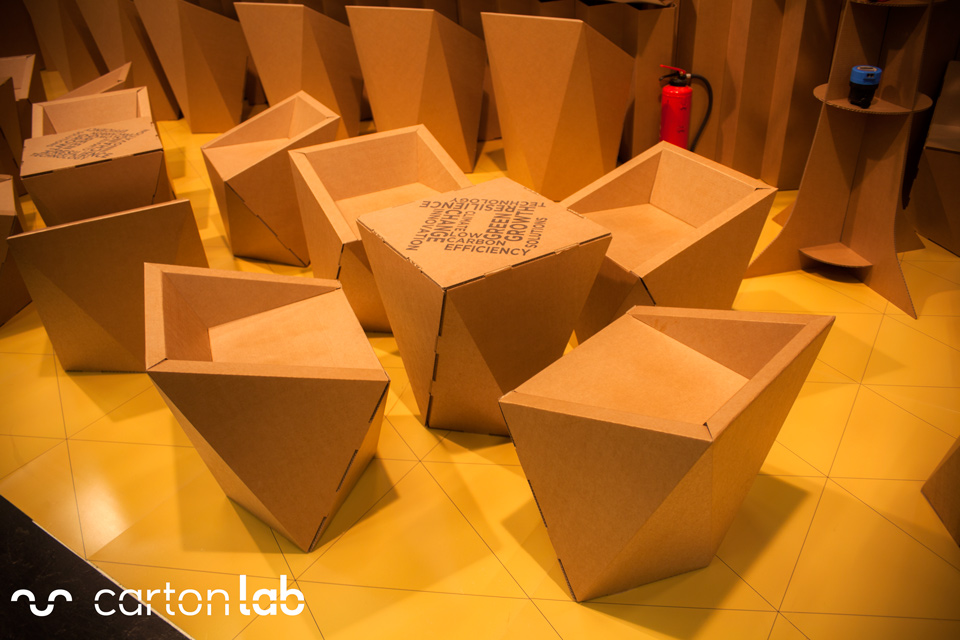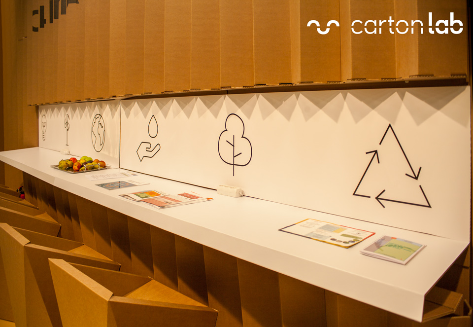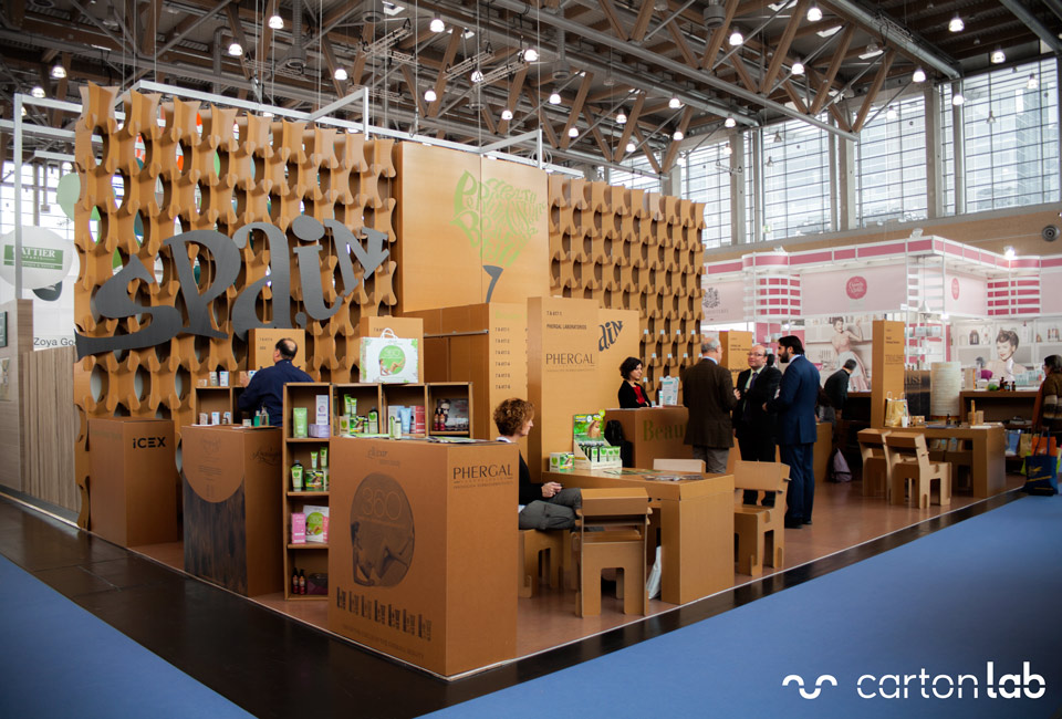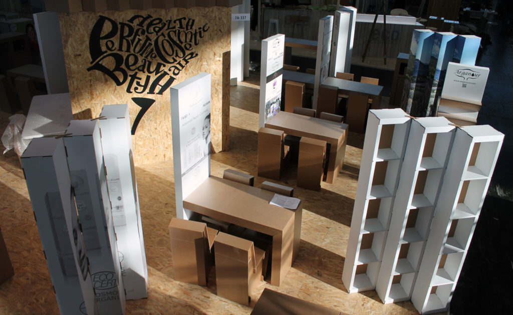 Nous avons adapté le design du stand de 10 x 12 m pour qu’il soit produit en carton.