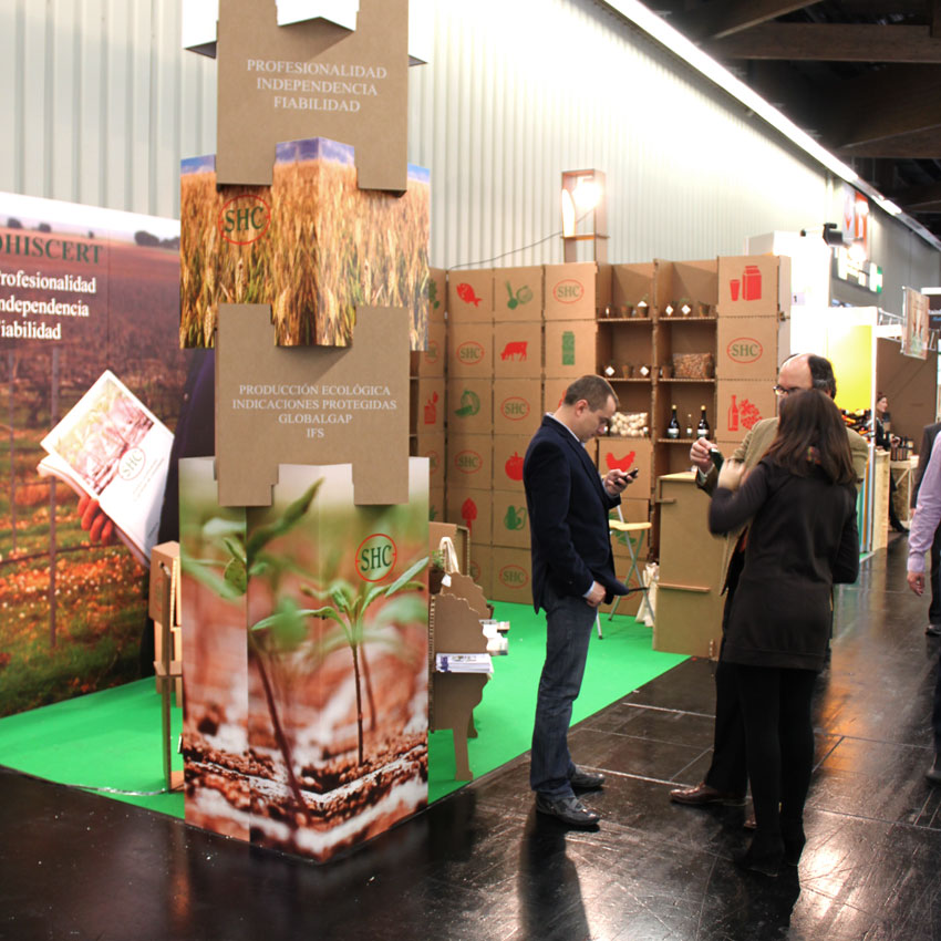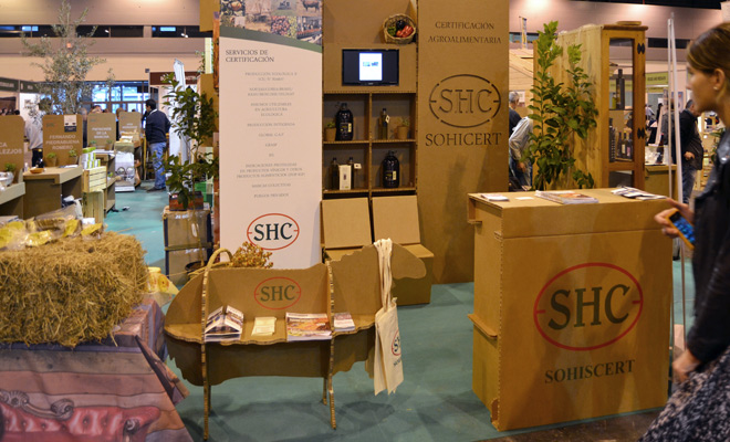 Nous avons conçu un stand en carton personnalisé pour l’entreprise andalouse Sohiscert à Biofach, le principal salon professionnel des produits biologiques. Cet événement se tient parallèlement à Vivaness au centre d’exposition de Nuremberg.