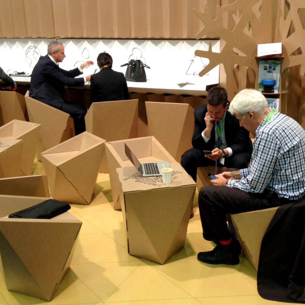Espace de réunion. Cet espace a été conçu pour les rencontres entre investisseurs, actionnaires et entrepreneurs. Composé de chaises Faceta et de tables en carton inspirées de l’origami, de nombreuses réunions intéressantes ont eu lieu dans cet espace pendant les 3 jours.