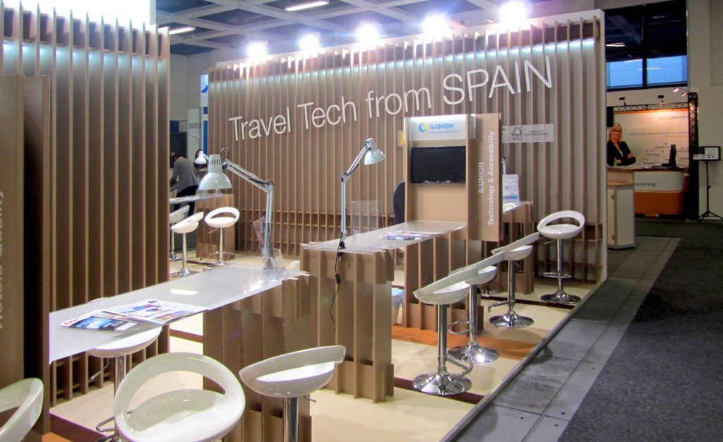 Nous avons fabriqué une couverture pour l’entrepôt en bois avec des lattes de carton semblables à celles du mur de séparation. Le treillis couvrait une grande partie de l’entrepôt et laissait un espace de 60 cm en haut, qui était destiné à l’identification du stand et où était incorporé un caisson lumineux en méthacrylate avec le mot Espagne. Nous avons également réalisé quelques bannières en carton avec le slogan Leading Travel Tech Solutions from Spain. Ces lettres ont été placées dans la partie de l’entrepôt située à côté du comptoir de service de l’ICEX.