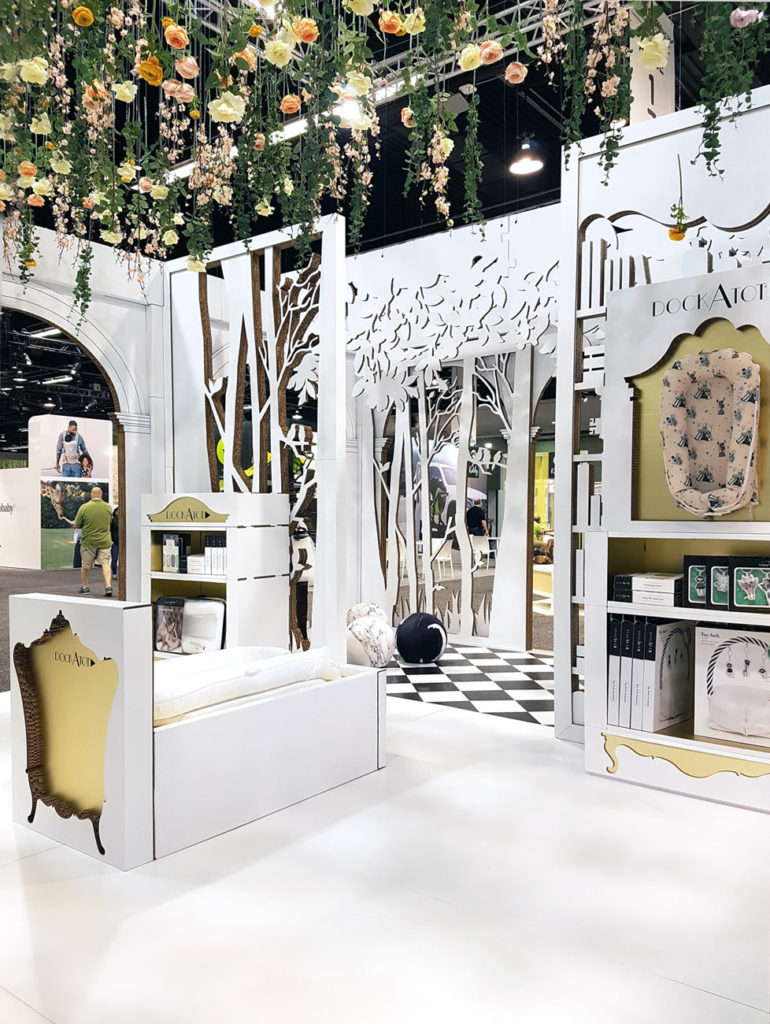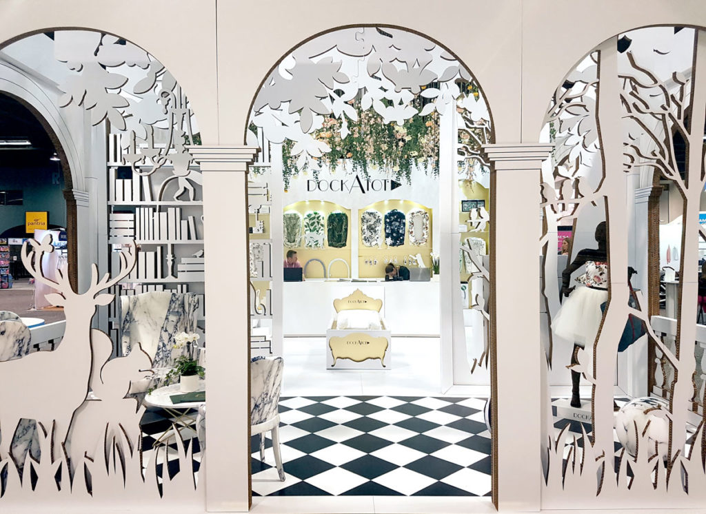 Les arches de ruines oubliées sont le seuil d’entrée dans le monde magique de DockATot. Le stand est distribué en deux zones différenciées qui construisent une atmosphère commune :