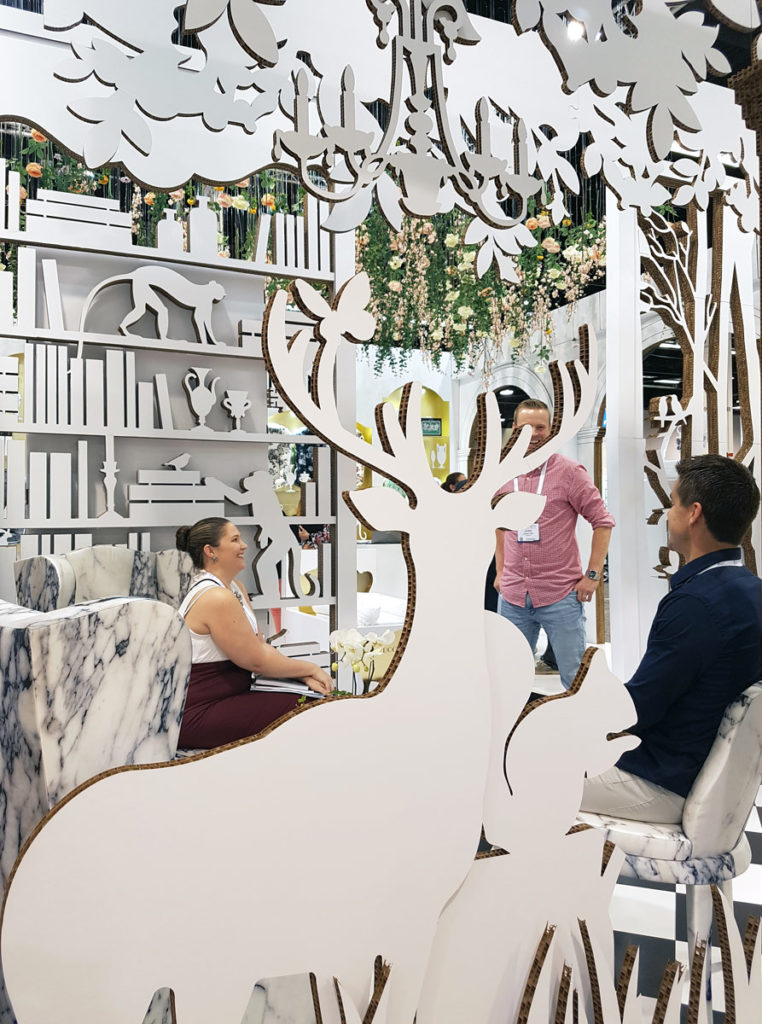 , d’animaux de la forêt, d’une bibliothèque, de vestiges de ruines romaines, etc. Cette enceinte décorative complexe est produite à partir de différentes couches de carton alvéolaire découpé à l’emporte-pièce. La succession de filtres crée une atmosphère onirique et séduisante, offrant différents degrés de transparence et d’intimité à l’ensemble du stand.