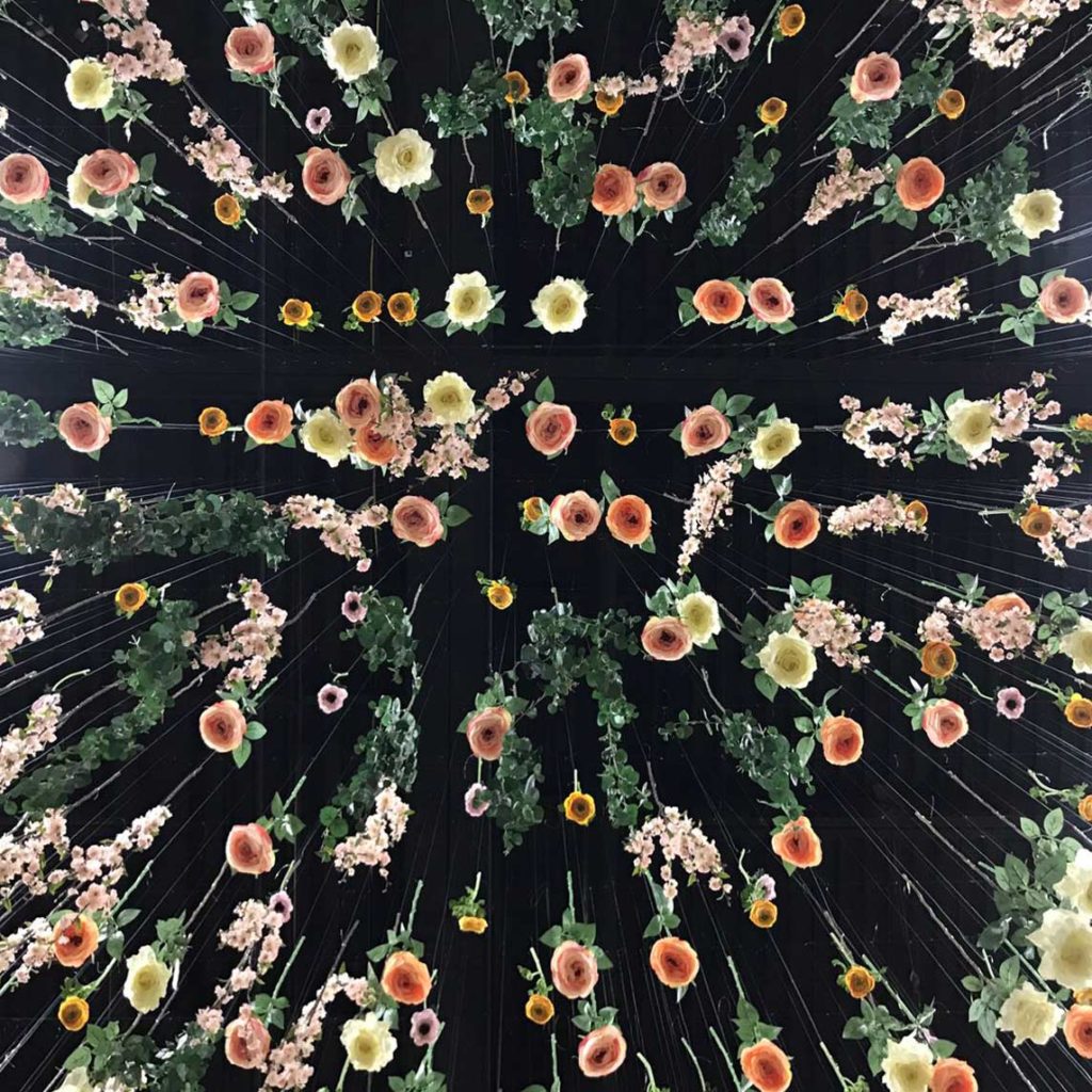 » est une zone principale d’attention du public et de présentation des produits, présidée par un comptoir et recouverte d’un paysage hypnotique de centaines de fleurs de soie multicolores suspendues au-dessus des visiteurs.