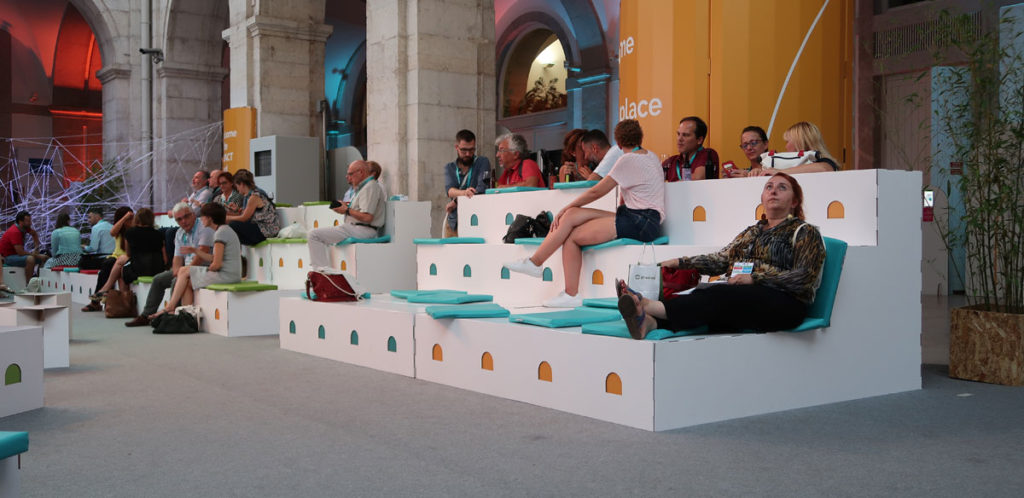 Chaque zone de réseautage a été aménagée pour l’occasion avec des cartons personnalisés : tables et bancs circulaires, tabourets et panneaux de séparation portant le graphisme de l’événement.
