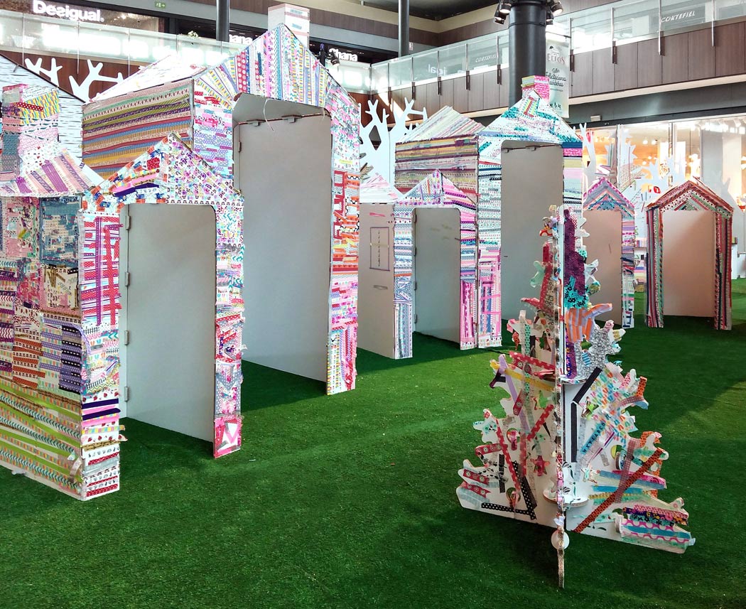 Los pueblos invernales son un clásico de la decoración navideña. Diseñarlos en cartón permite una instalación sencilla, reutilizarlos una vez desmontados y personalizarlos a tu gusto. La ‘Villa de los Elfos’ del CC Thader en Murcia fue un buen ejemplo. Presidida por un gran árbol de navidad de 4,5 m de altura, incluia varias casitas de cartón, árboles pequeños, un mostrador de atención al público, taburetes y mesas.