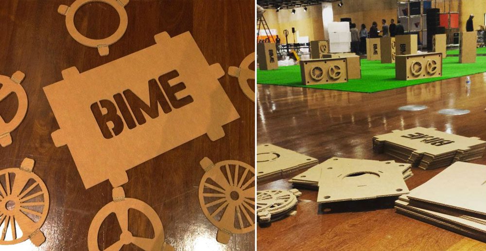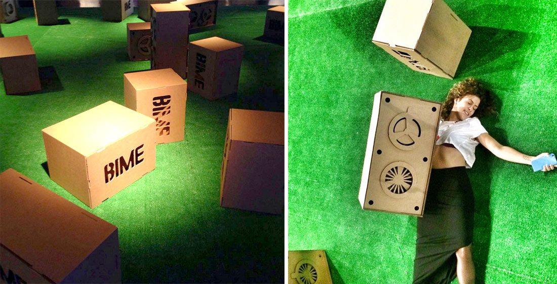 Gracias a la agencia El Hervidero de Ideas hemos participado en la producción de estos altavoces taburete realizados en cartón que sirvieron para amueblar la zona relax del festival BIME. En total se han realizado más de 30 piezas en distintos tamaños y formatos, que los asistentes al festival utilizaron como mesas y taburetes funcionales.