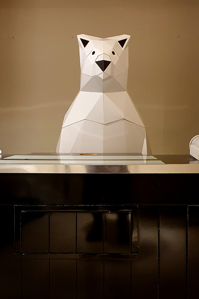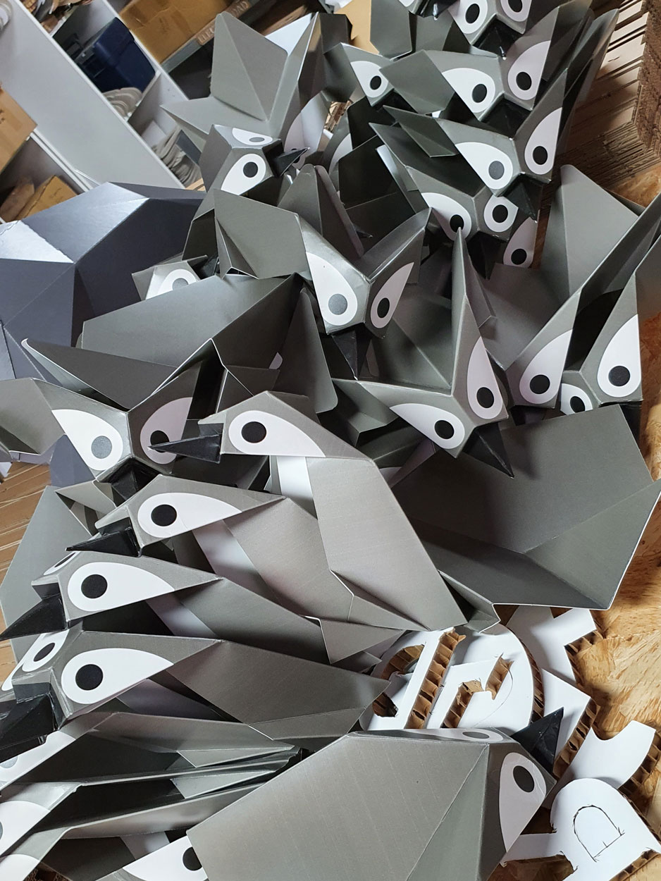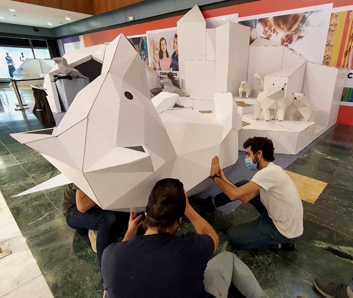 En cuanto a animales, combinamos técnicas low poly y origami. El ensamblaje más complejo fue el del oso gigante que preside el espacio. Hasta cuatro personas unieron fuerzas para el momento de su colocación.