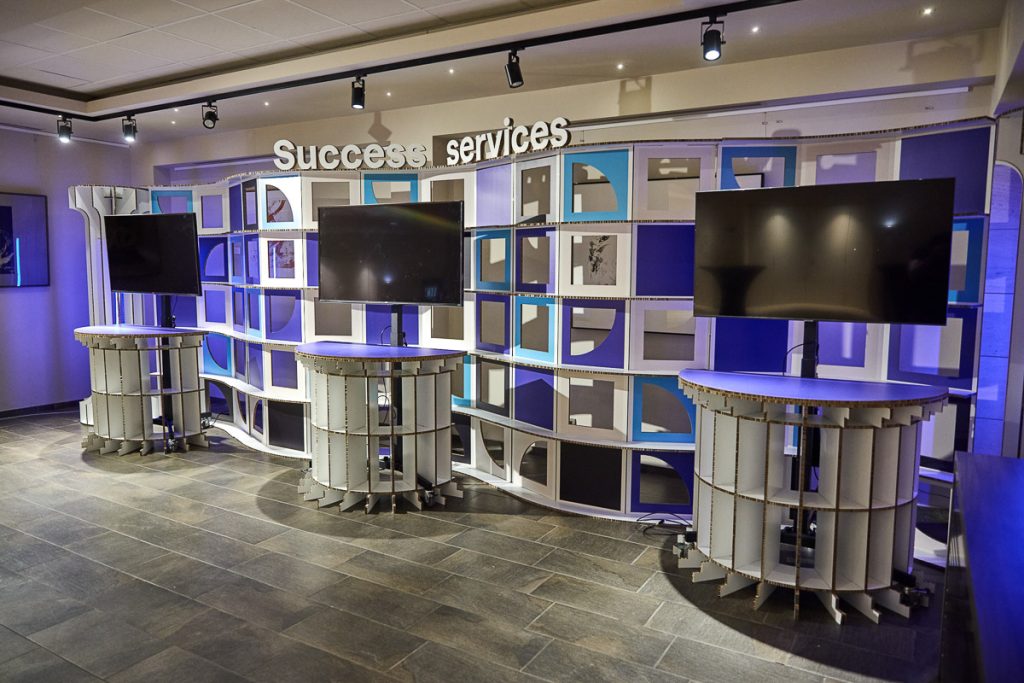 Para el mobiliario, diseñamos mostradores, atriles y mesas auxiliares en distintos tamaños, pensando siempre en la funcionalidad y la estética. Los muebles personalizados te aportan soluciones prácticas y con estilo a las que le puedes aplicar los colores y formas corporativas del cliente. En este caso, el mobiliario seguía la estética de lamas encajables del resto de elementos e incluía rótulos informativos.