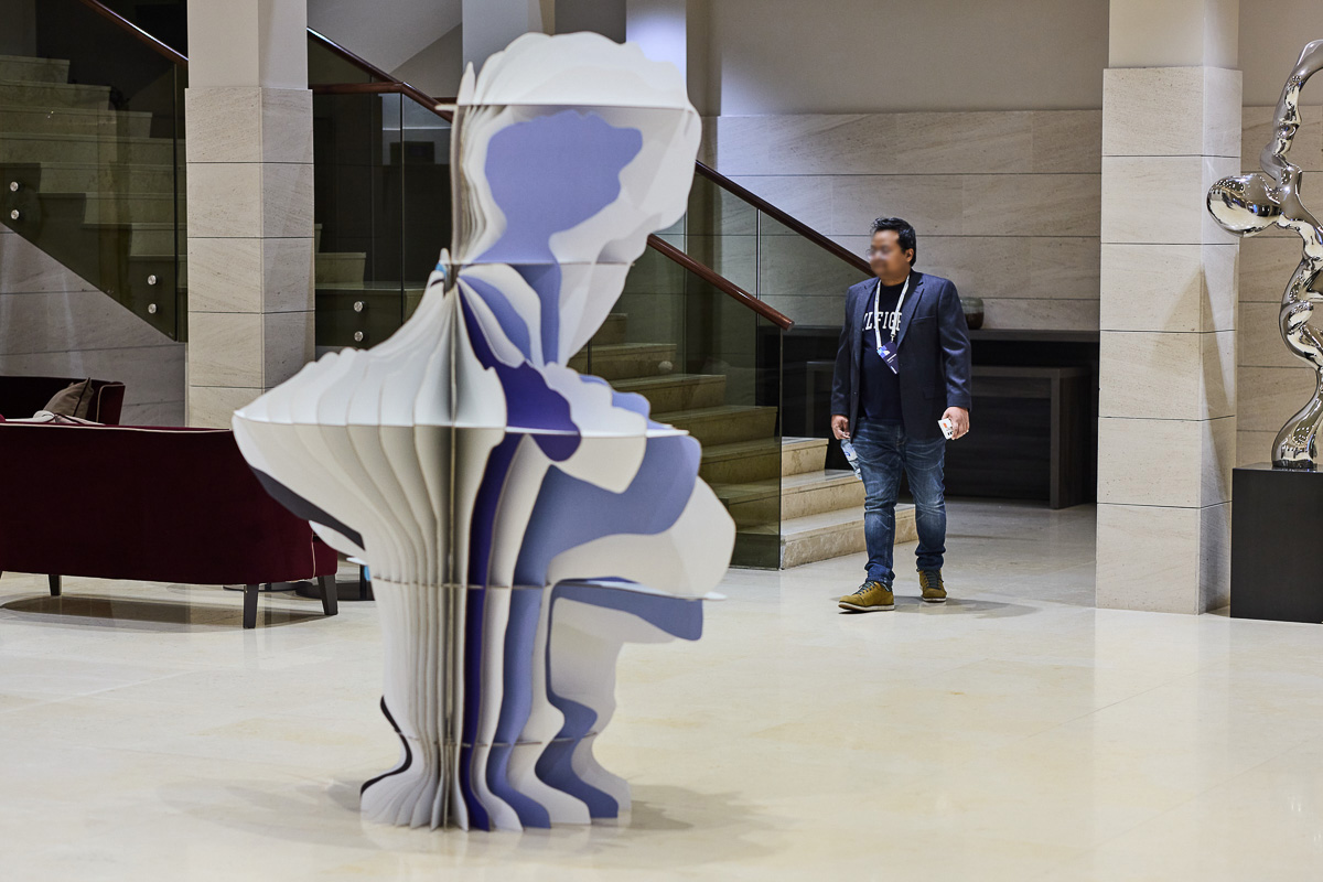 Como contrapunto a la inspiración clásica de los elementos decorativos, incluimos unas figuras troqueladas impresas. Un toque de color y diversión desenfadada que servía además de señalización para orientar a los asistentes hacia los distintos espacios del evento.