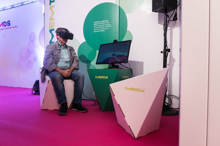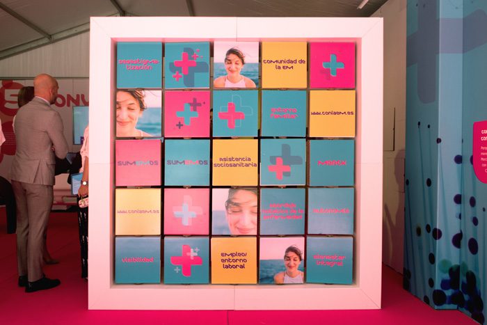 Para crear los diferentes espacios del evento montamos 80 módulos-trasera de pared. Su función variaba según la zona, pero todos estaban diseñados en cartón y llevaban impresión digital aplicada en sus caras visibles. Con esta técnica instalamos desde un photocall hasta paneles informativos sobre la enfermedad.