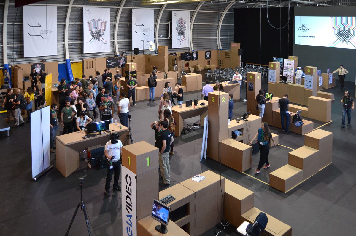 Loop ha supuesto todo un ejemplo de reutilización. Para empezar, empleamos la mitad del material que conservábamos de otro evento, concretamente el Transmedia Festival . Este, a su vez, ya contaba con algunos elementos reutilizados. Así que, los módulos rectangulares en distintos tamaños empleados en Loop como mostradores o bancos habían hecho su servicio como stands de Transmedia. Y las traseras habían sido en su origen ¡un laberinto infantil!