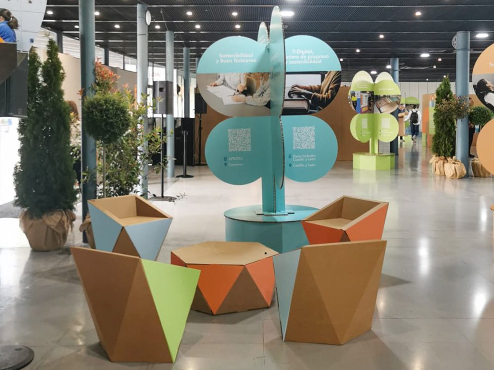 Utilizando muebles de cartón puedes cubrir todas las necesidades que implica el diseño para eventos de inclusión social.